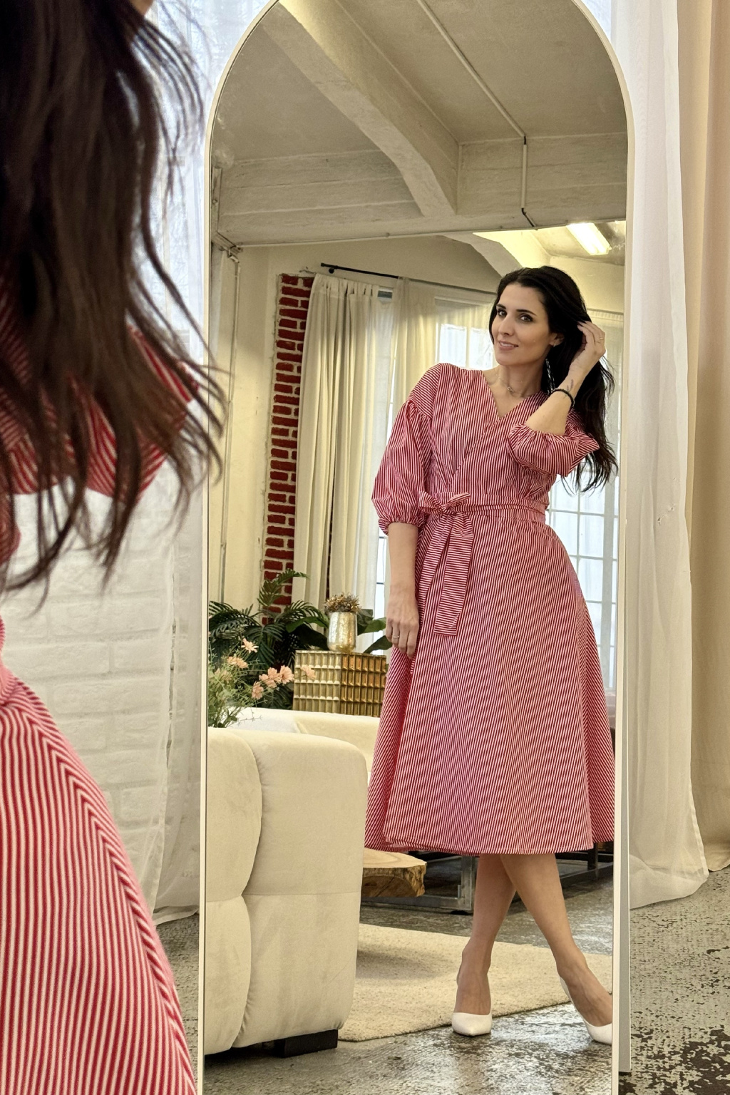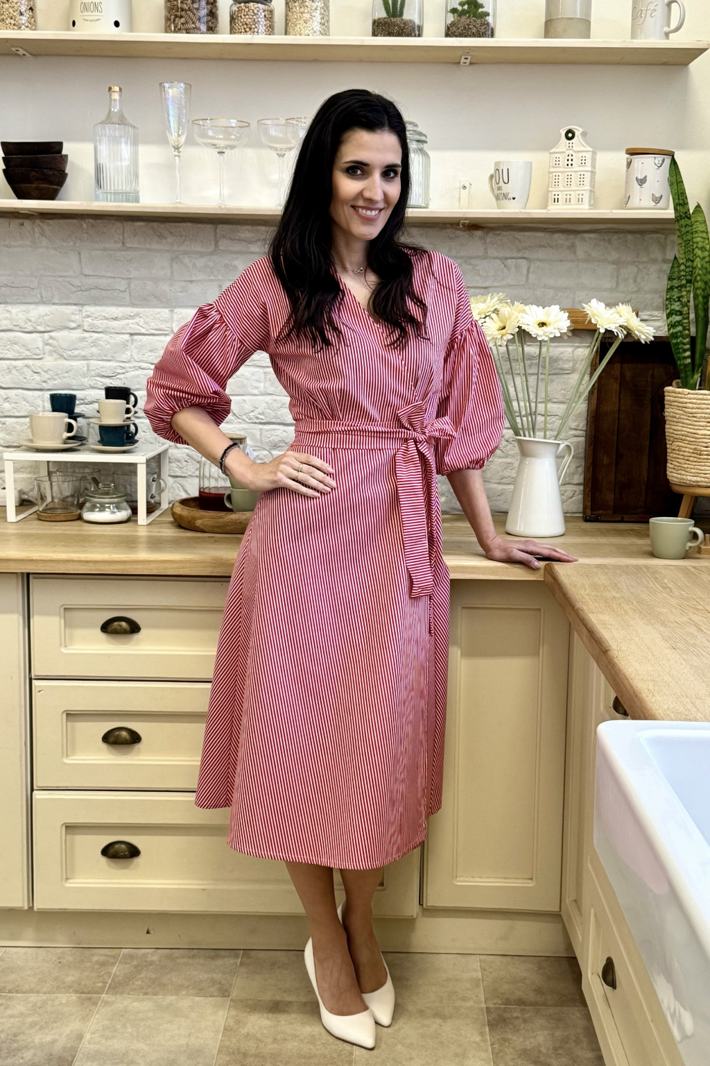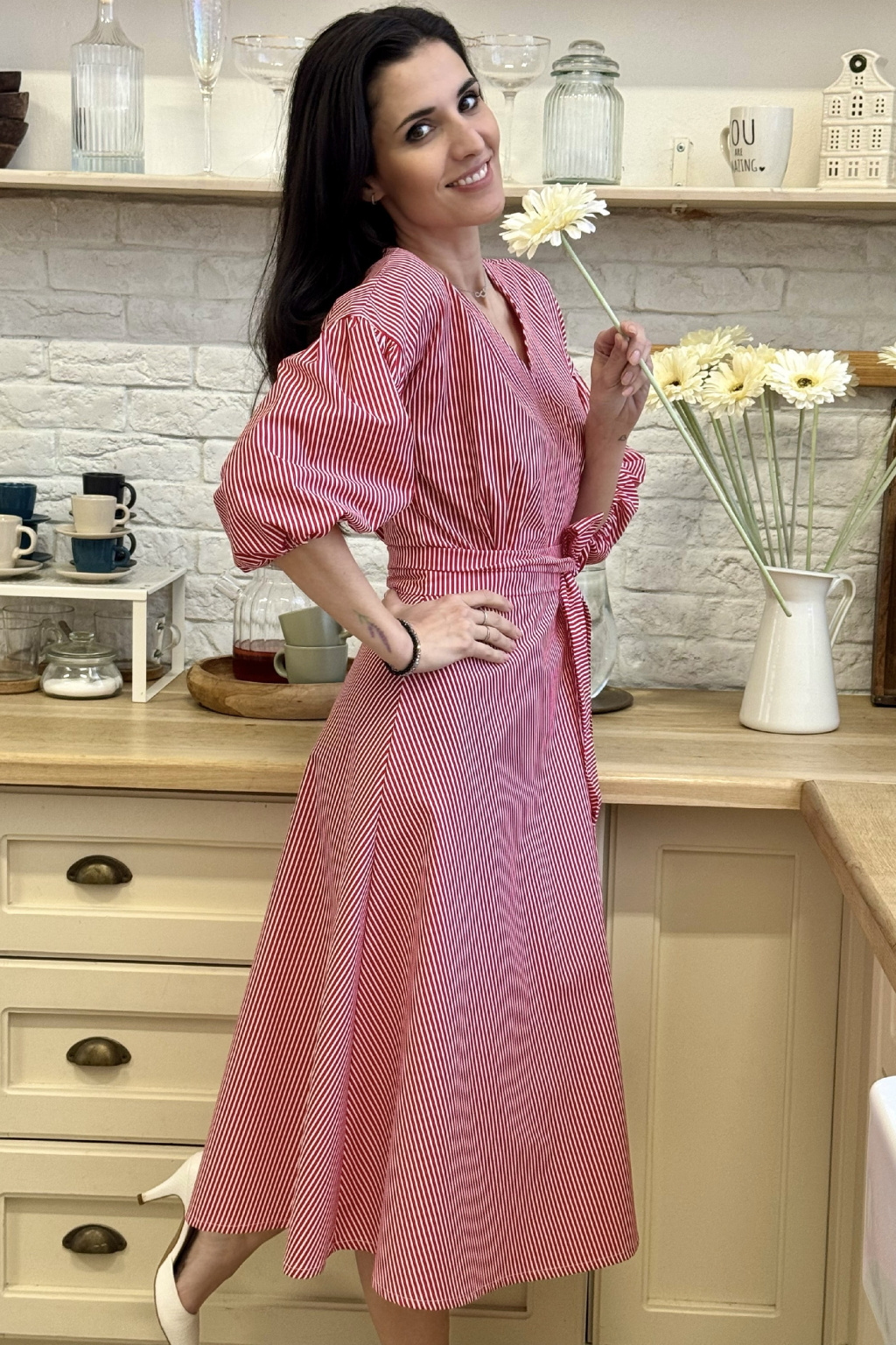 Bavlněné zavinovací šaty s bílo-červenými proužky s možností výběru velikosti, rukávů a délky.