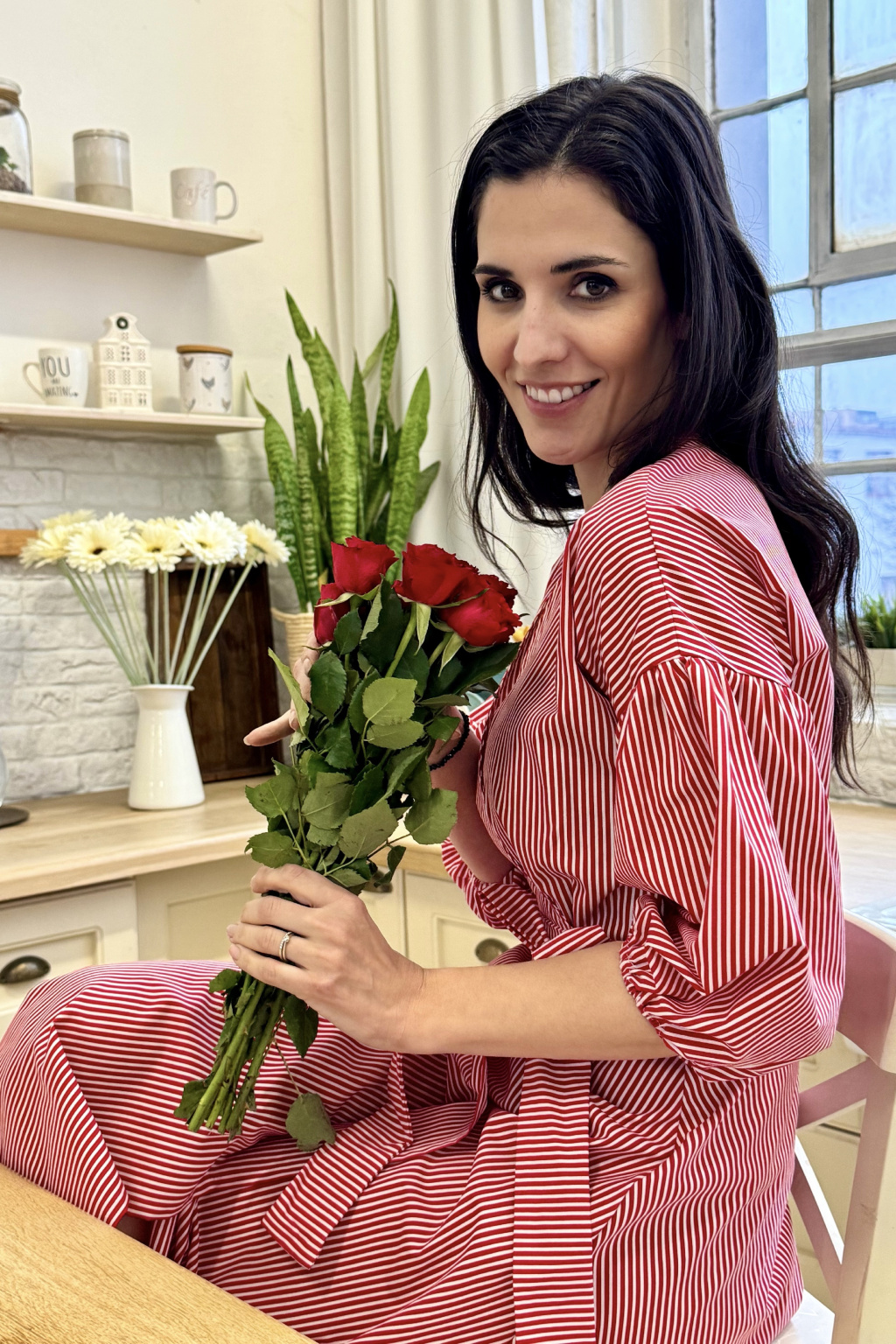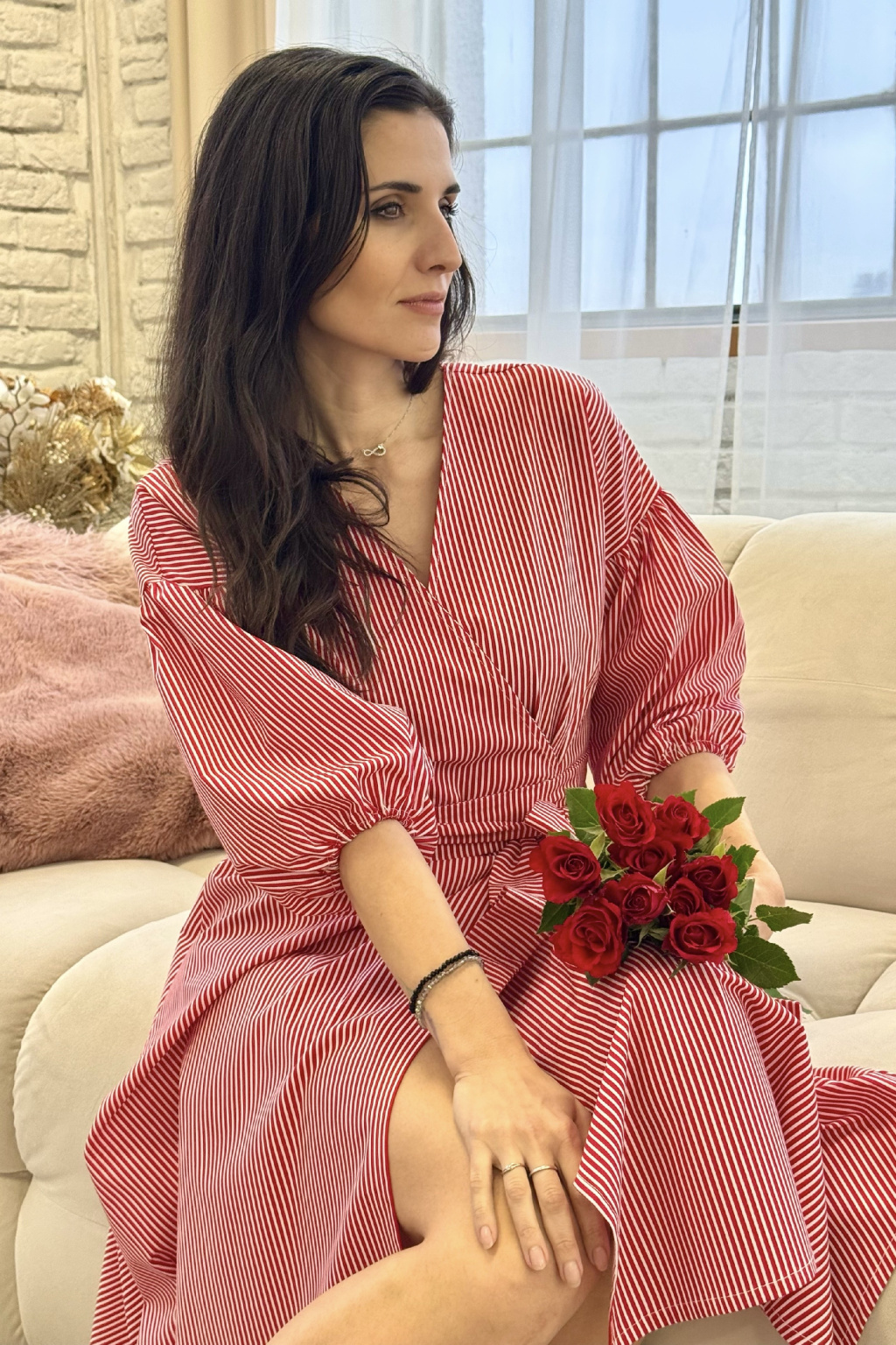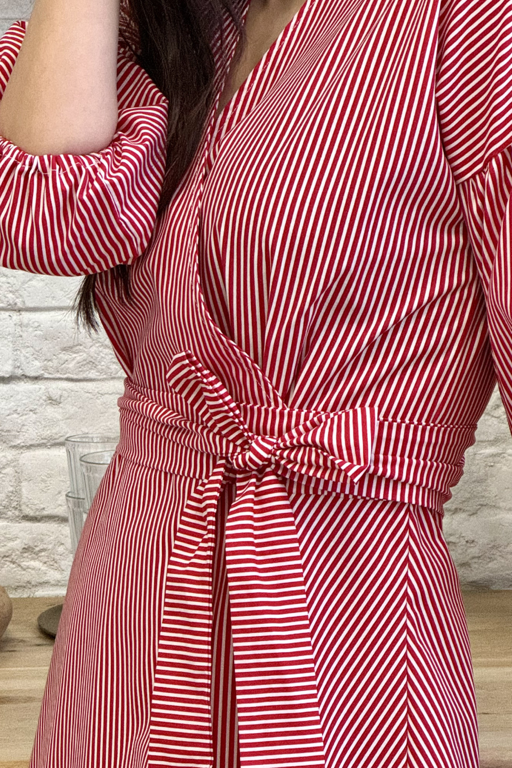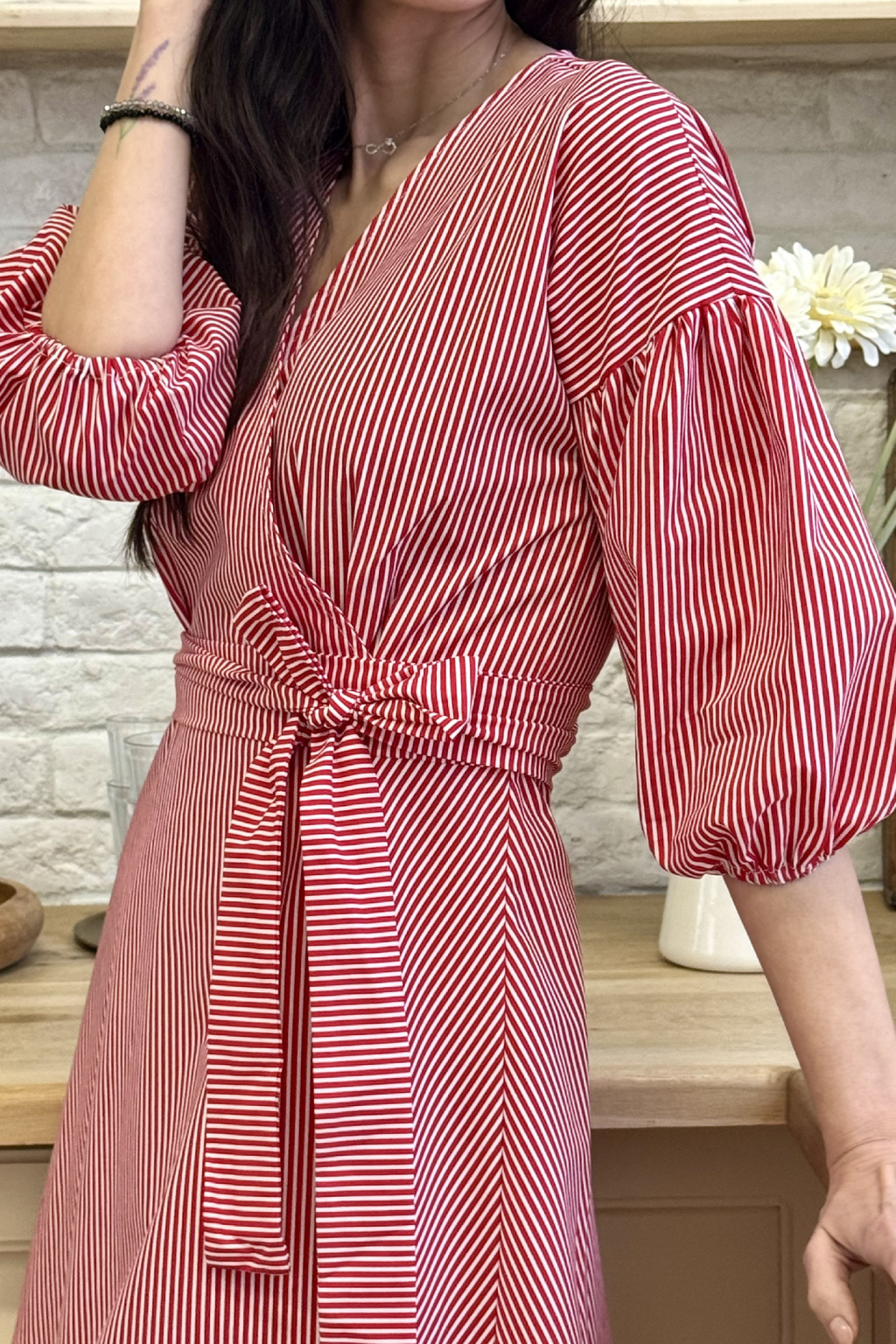 Bavlněné zavinovací šaty s bílo-červenými proužky s možností výběru velikosti, rukávů a délky.