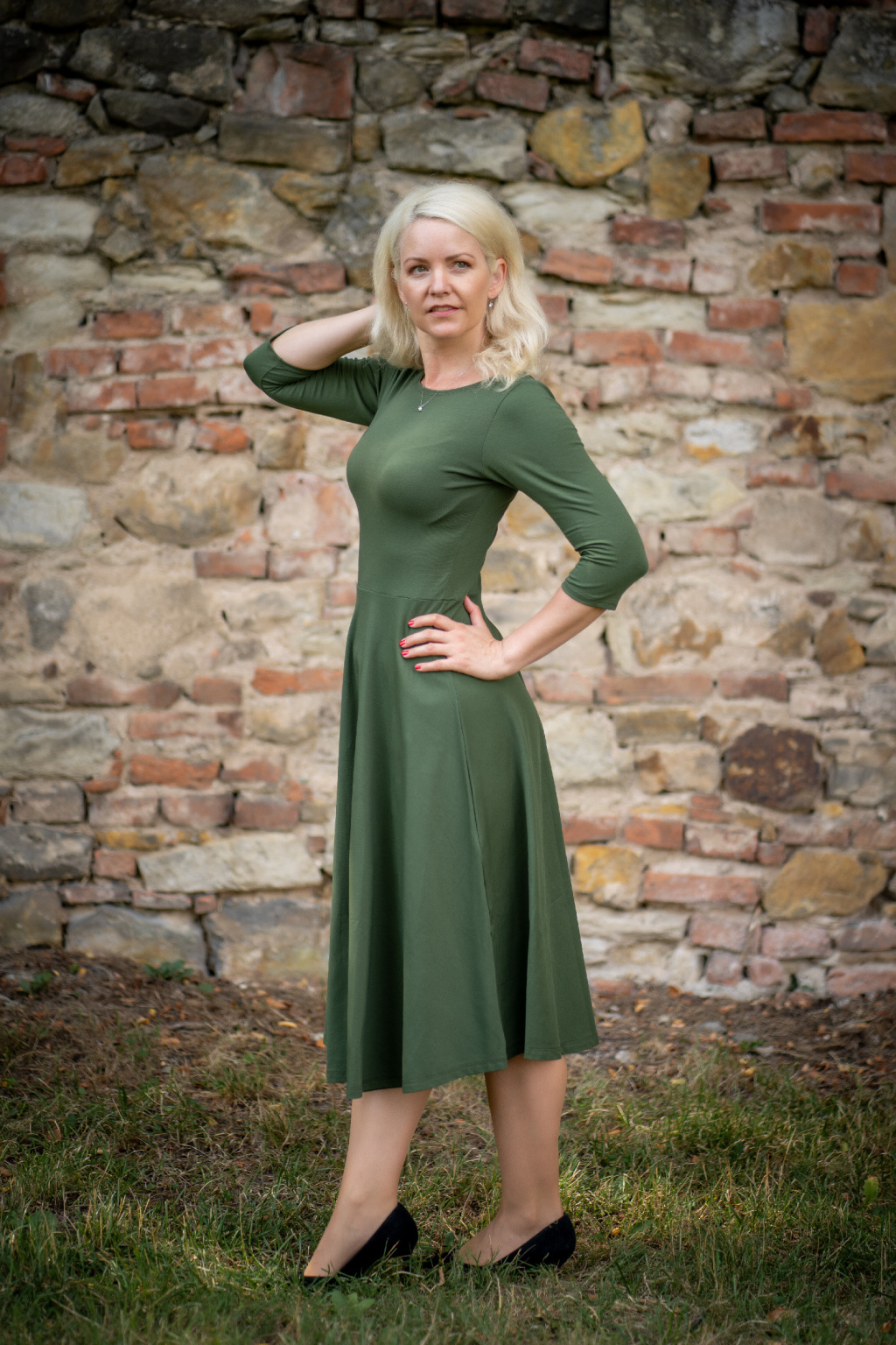 Modelka na fotce má na sobě: šaty vel. XS, midi s délkou 120cm, půlkolovou sukni, lodičkový výstřih, 3/4 rukáv, je vysoká 171 cm.
