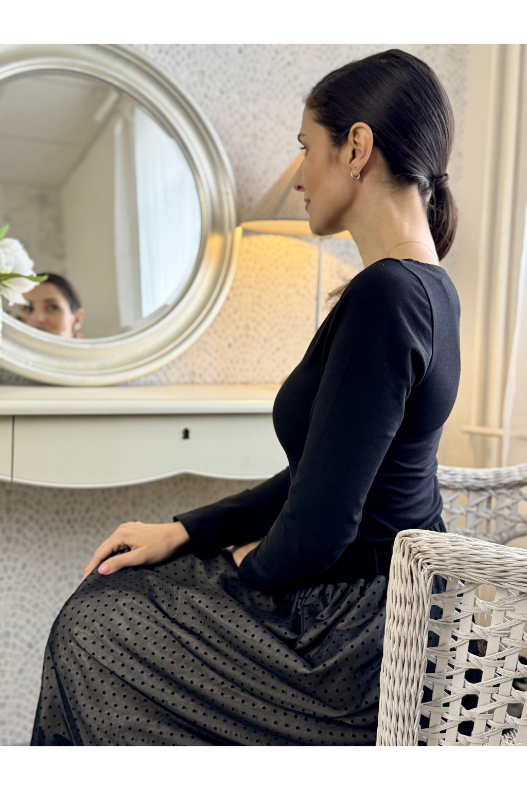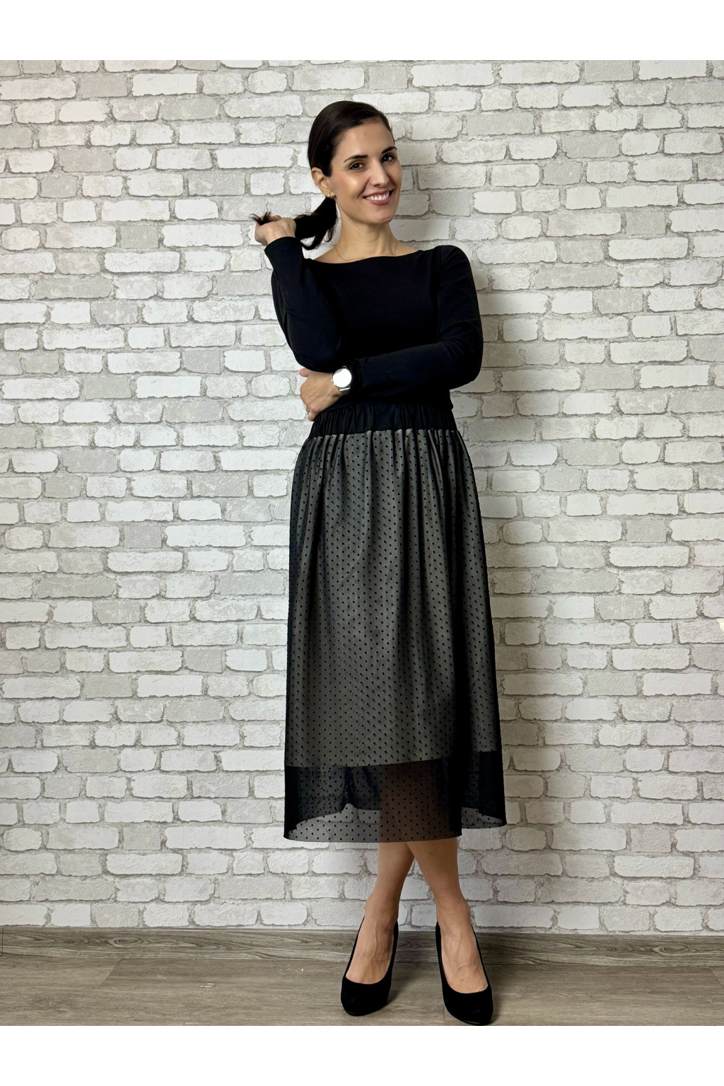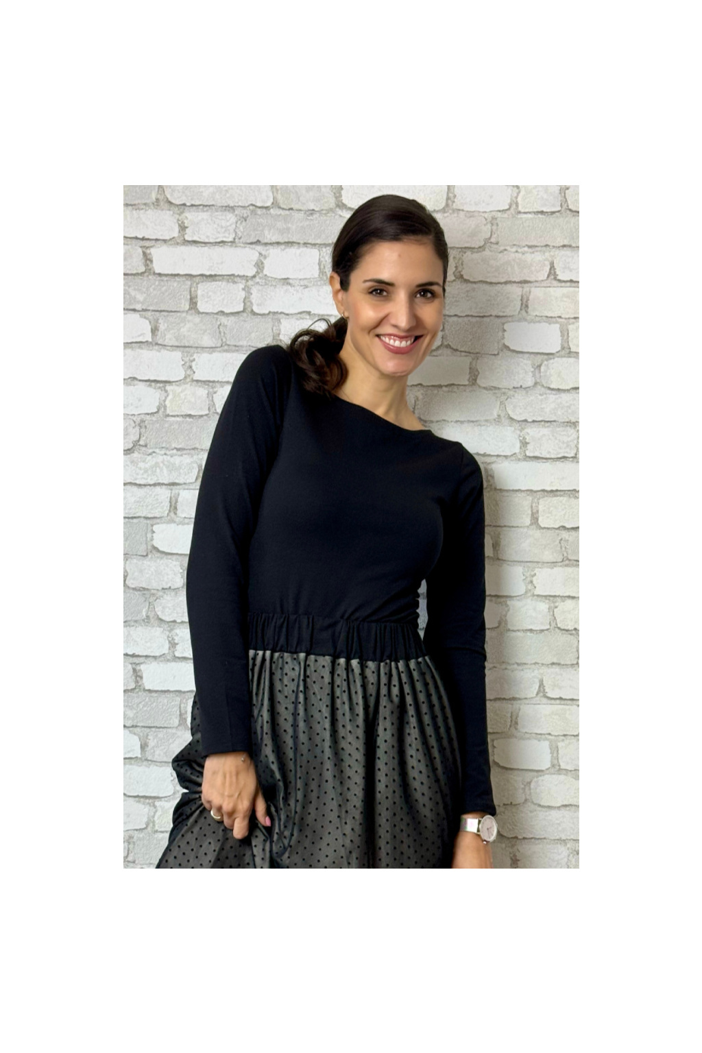 Modelka na fotce má na sobě: tričko vel. XS, kulatý výstřih, 3/4 rukáv.