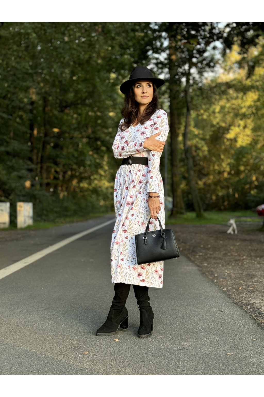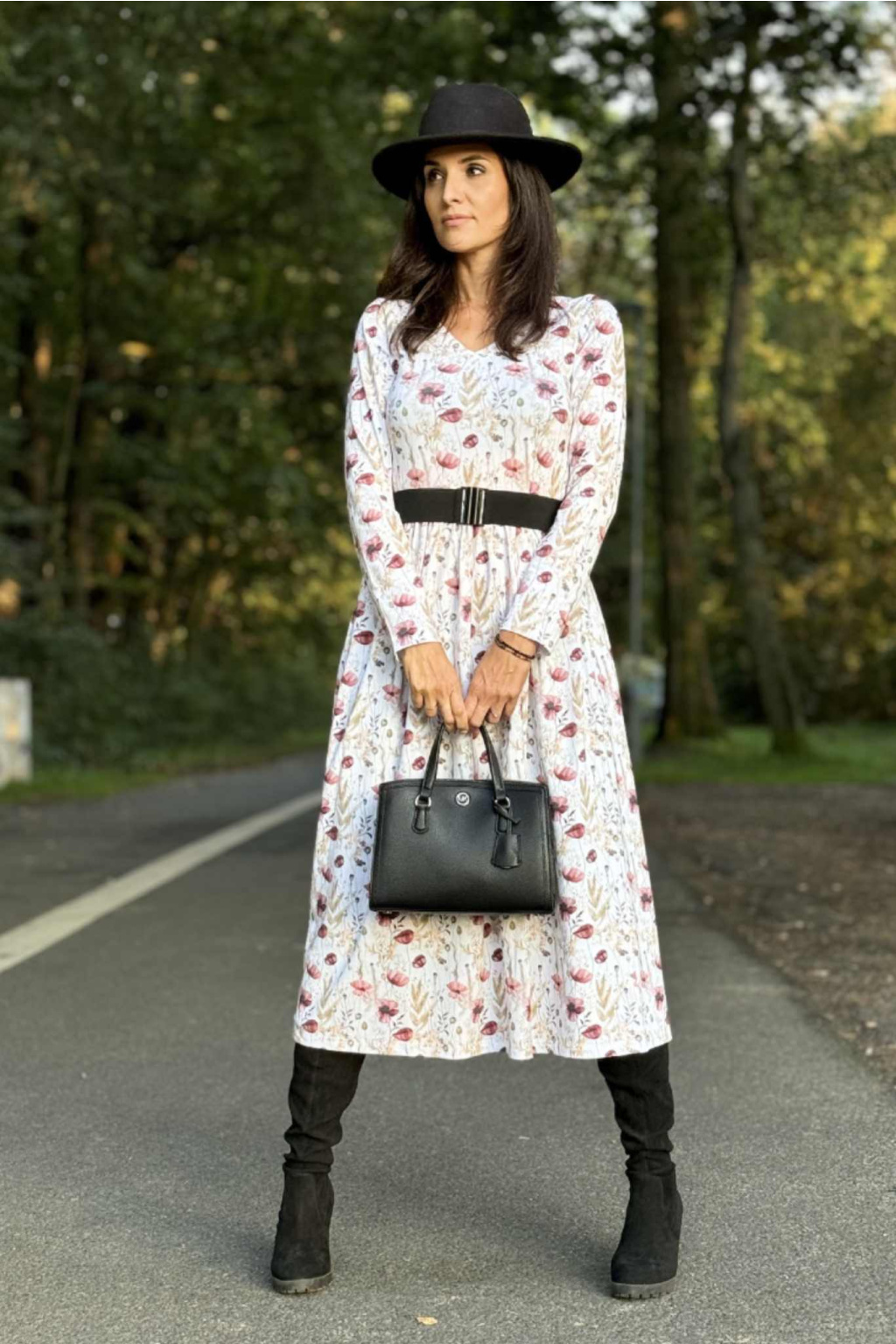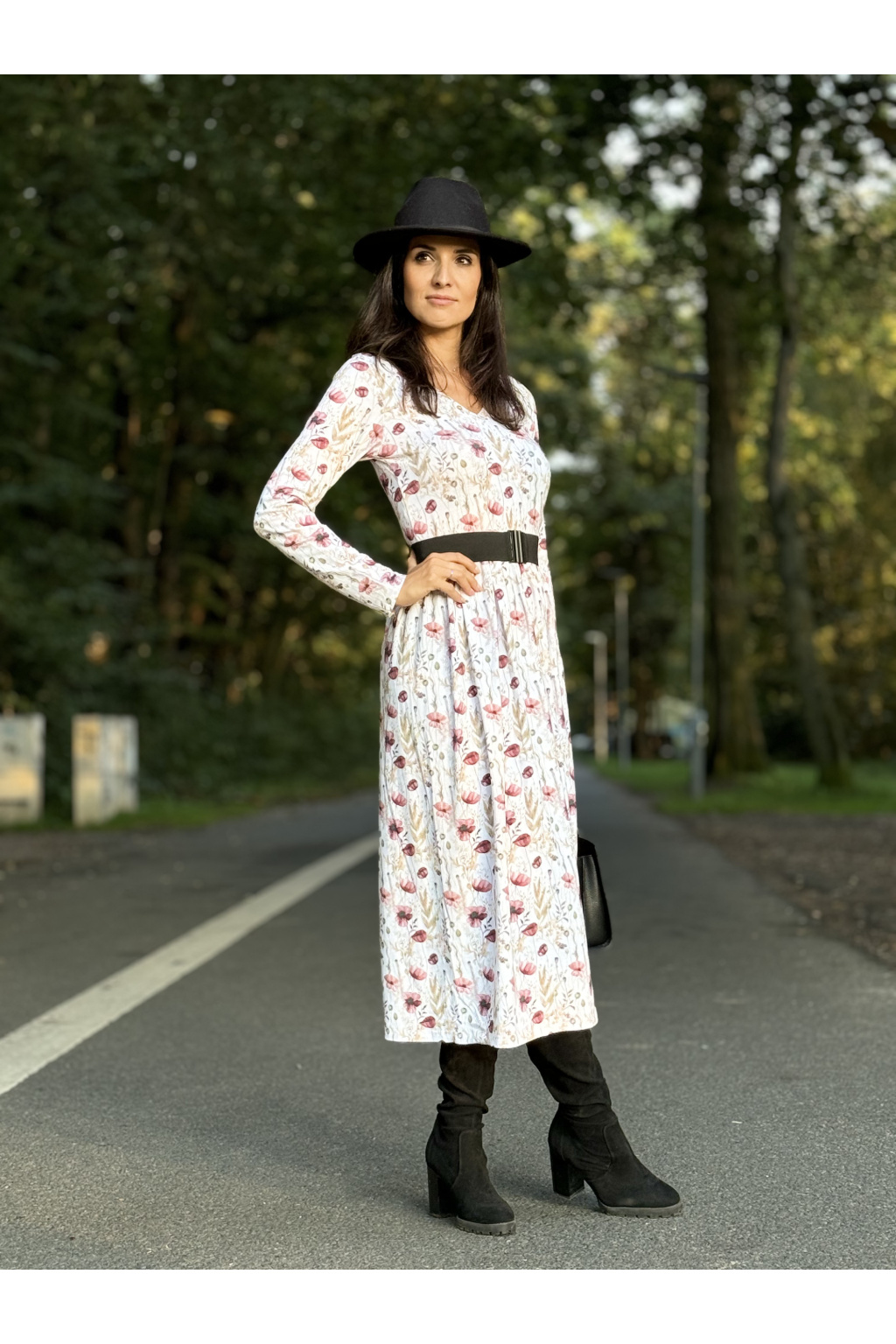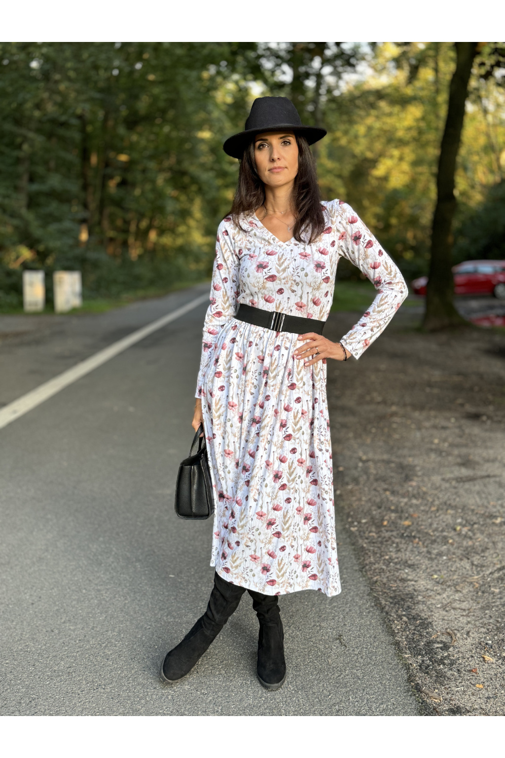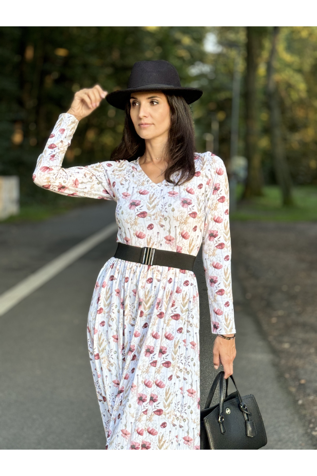 Modelka má na sobě: šaty vel. S, V-čkový výstřih, řasenou sukni, dlouhý rukáv, délku šatů 120 cm, je vysoká 170 cm.