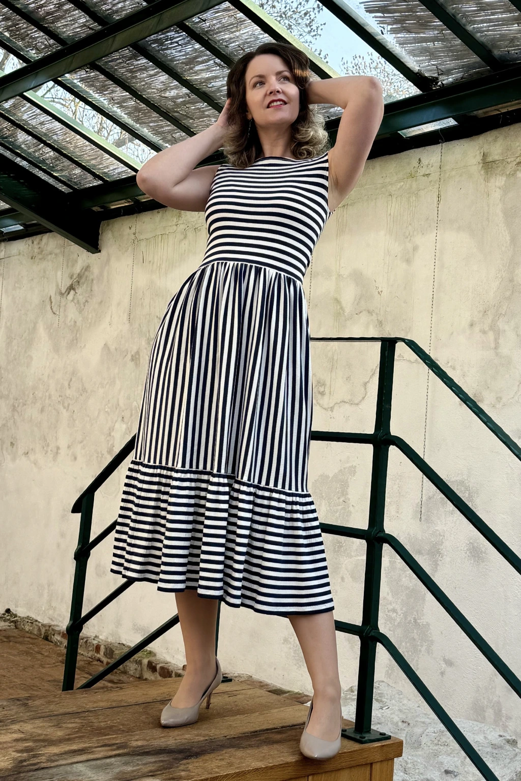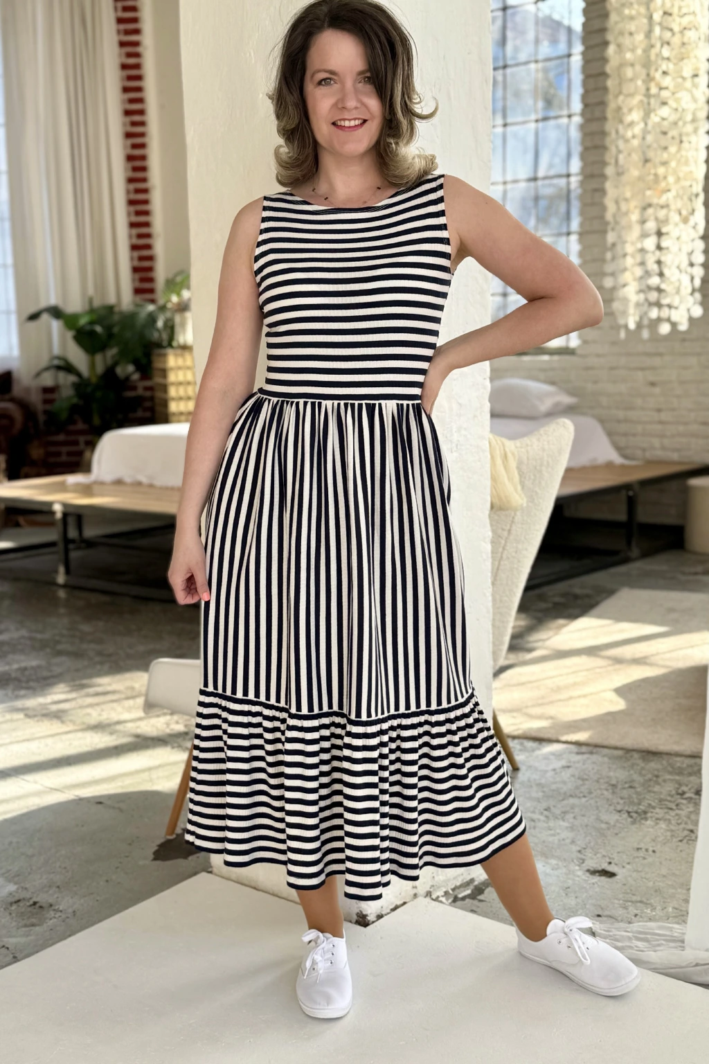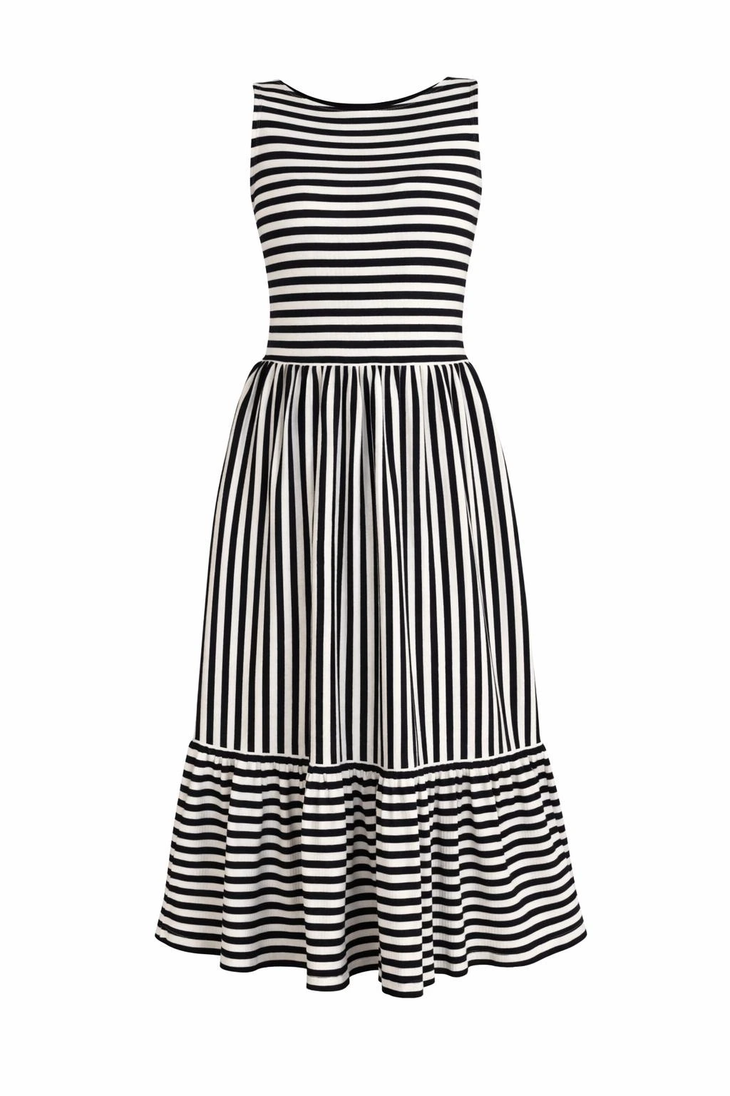 Proužkované šaty řasené - modro - smetanová - 2 týdny