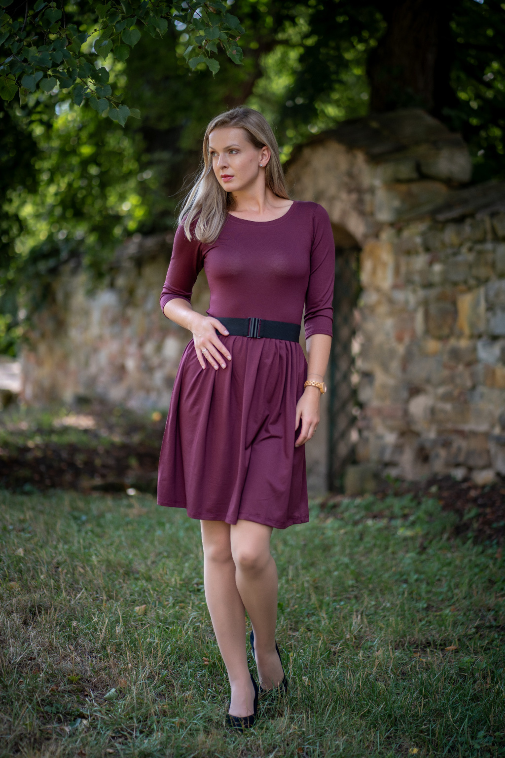 Modelka na fotce má na sobě: šaty vel. XS, krátké s délkou 95 cm, řasenou sukni, kulatý výstřih, 3/4 rukáv, je vysoká 174 cm.