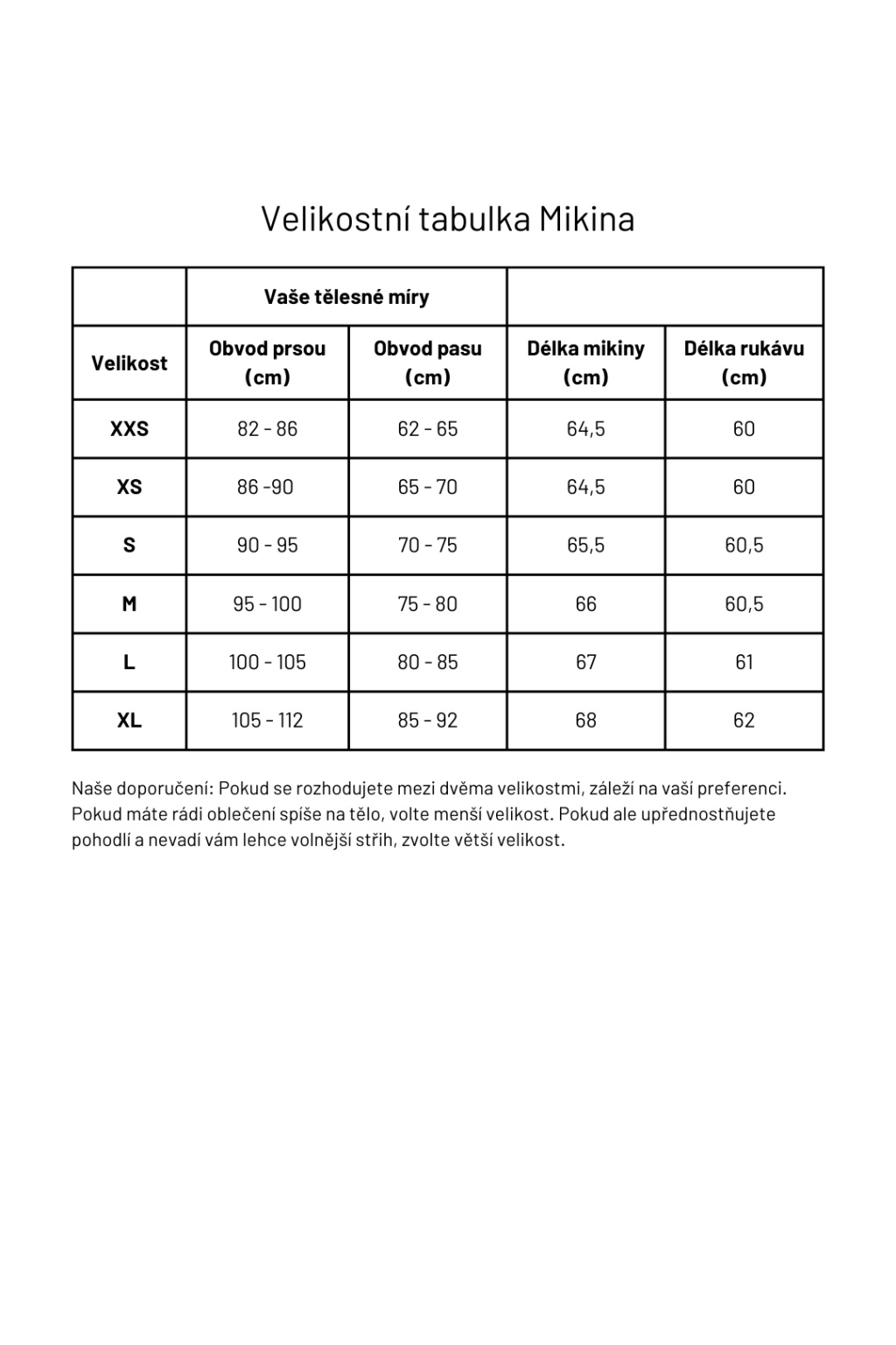 Délka mikiny: XXS, XS (64,5 cm), S (65,5 cm), M (66 cm), L (67 cm), XL (68 cm)