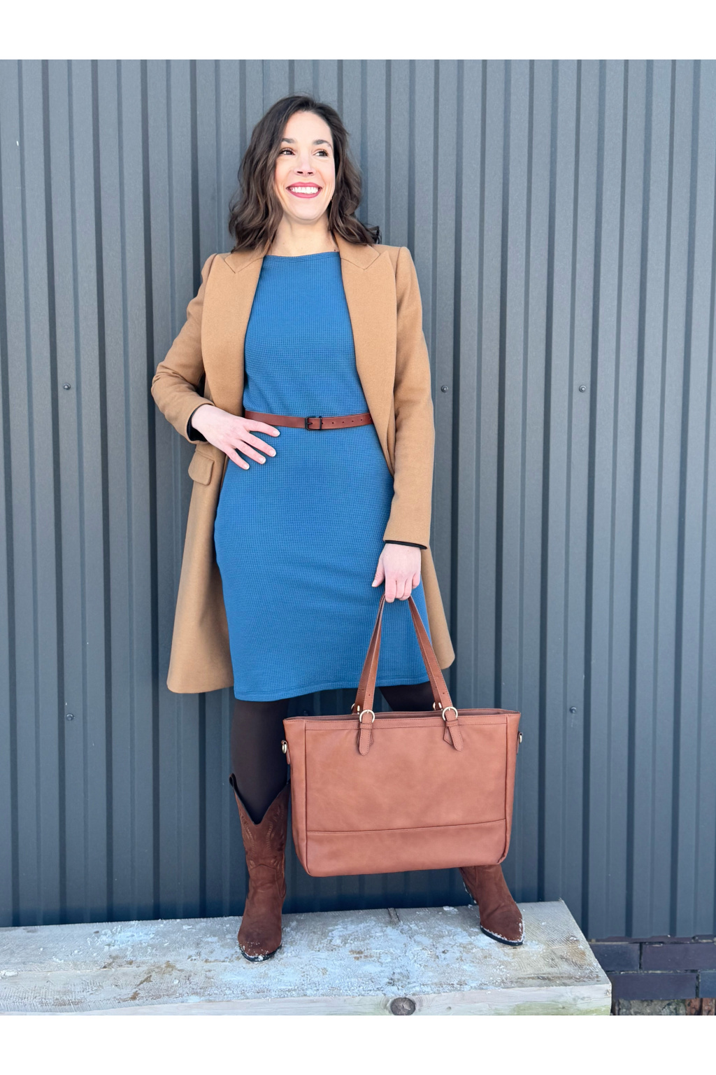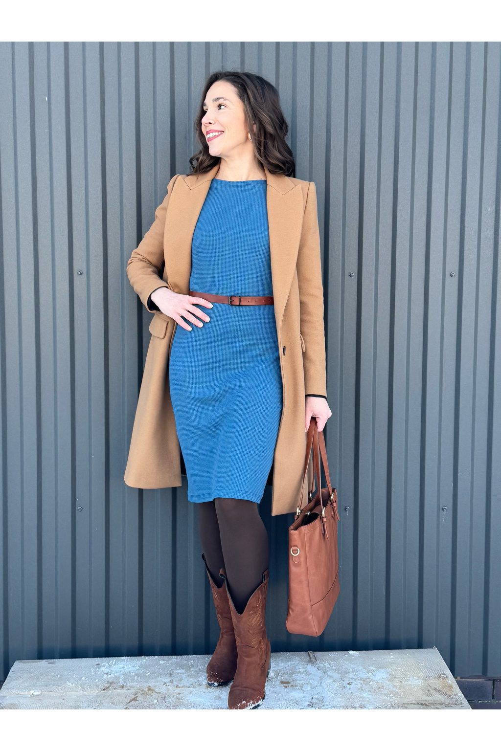 Vaflové bio bavlněné úzké šaty - Zarina - džínová modrá - krátké / midi - 4 týdny