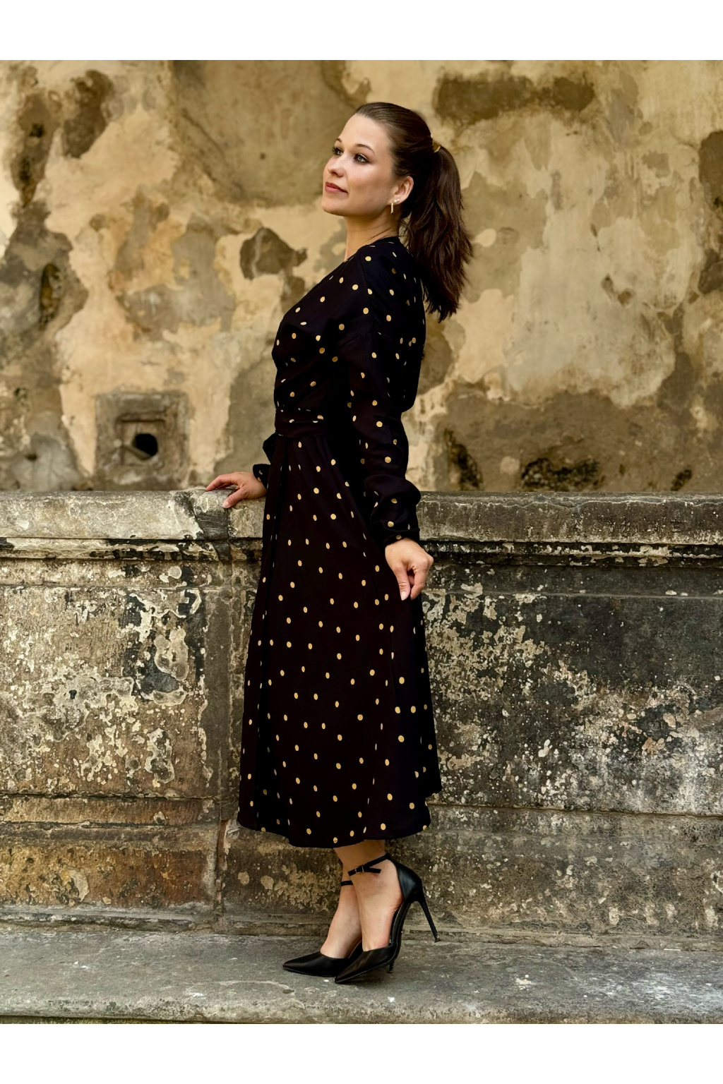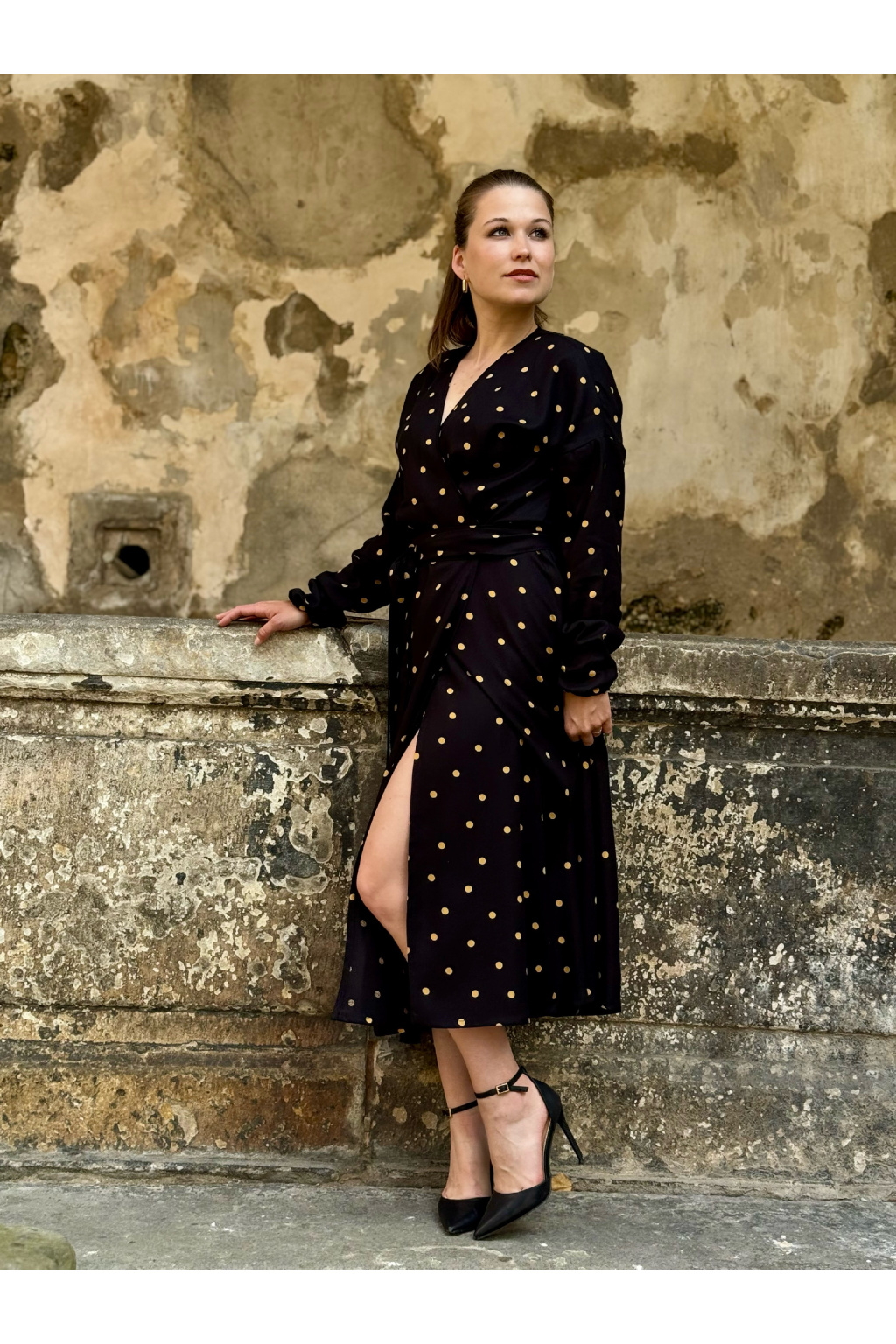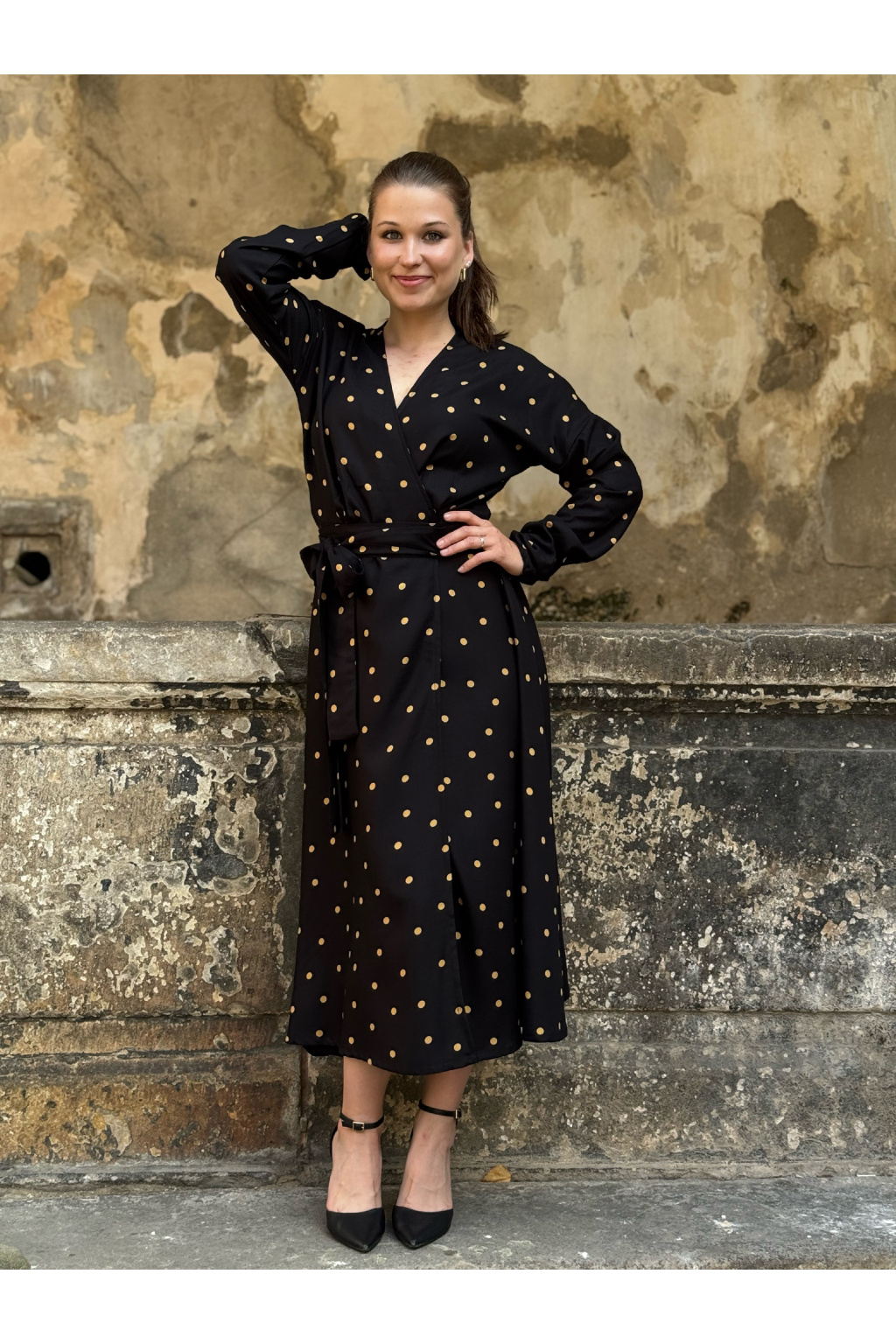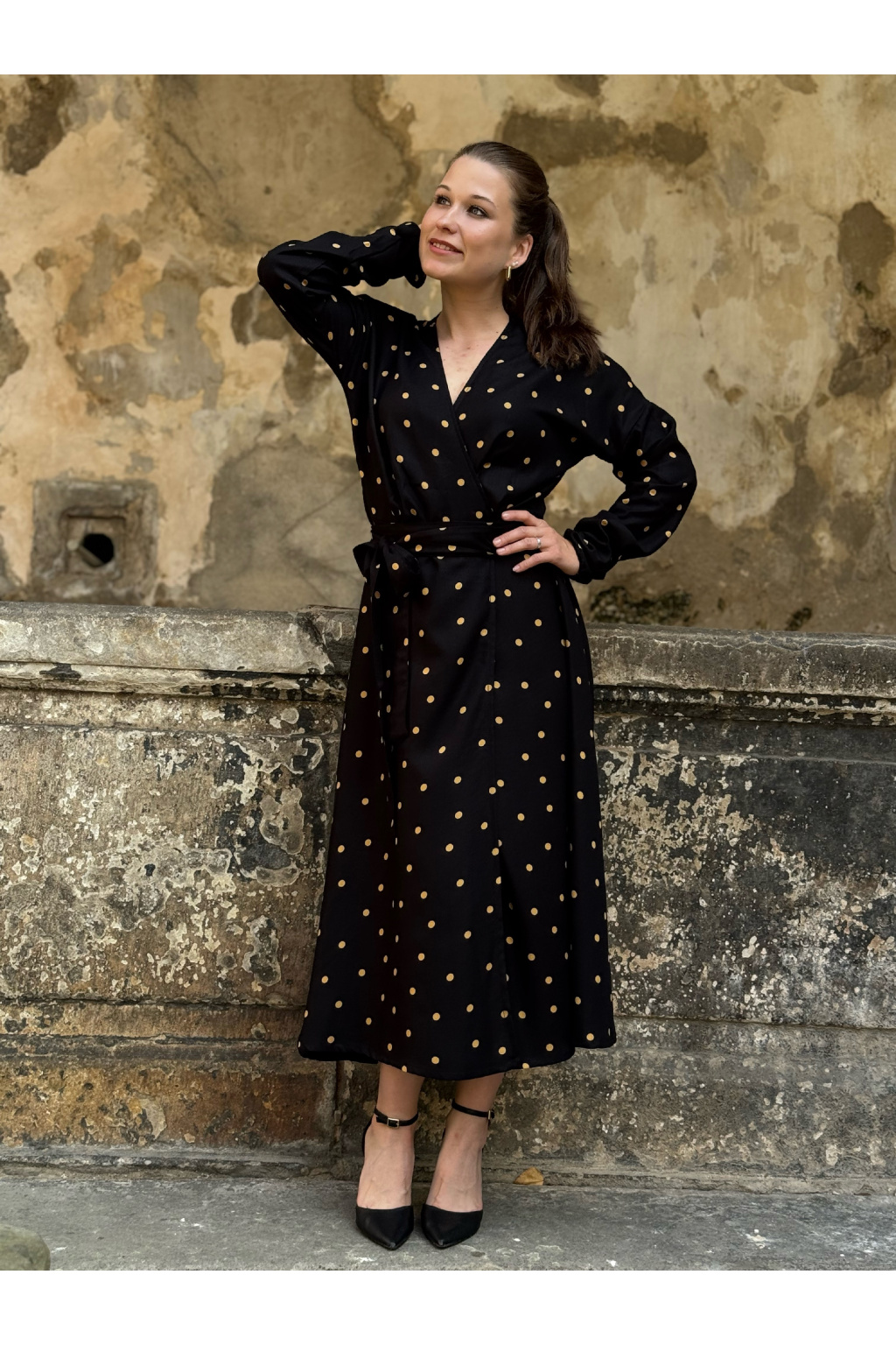 Zavinovací šaty v černé barvě se zlatými puntíky s možností výběru velikosti, rukávů a délky.