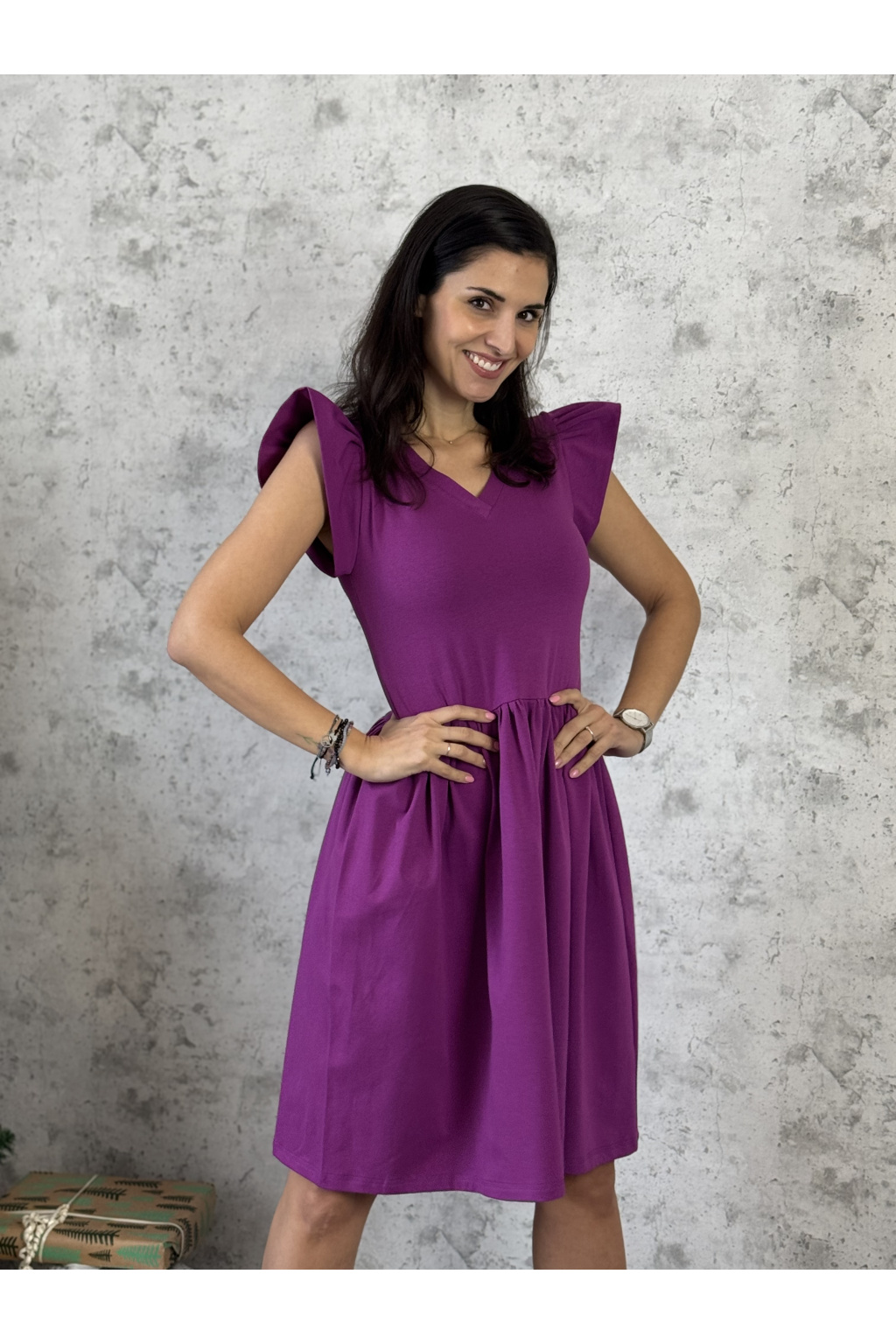 Modelka na fotce má na sobě: vel. XS, krátké s délkou 95 cm, řasenou sukni, V-čkový výstřih, je vysoká 170 cm.