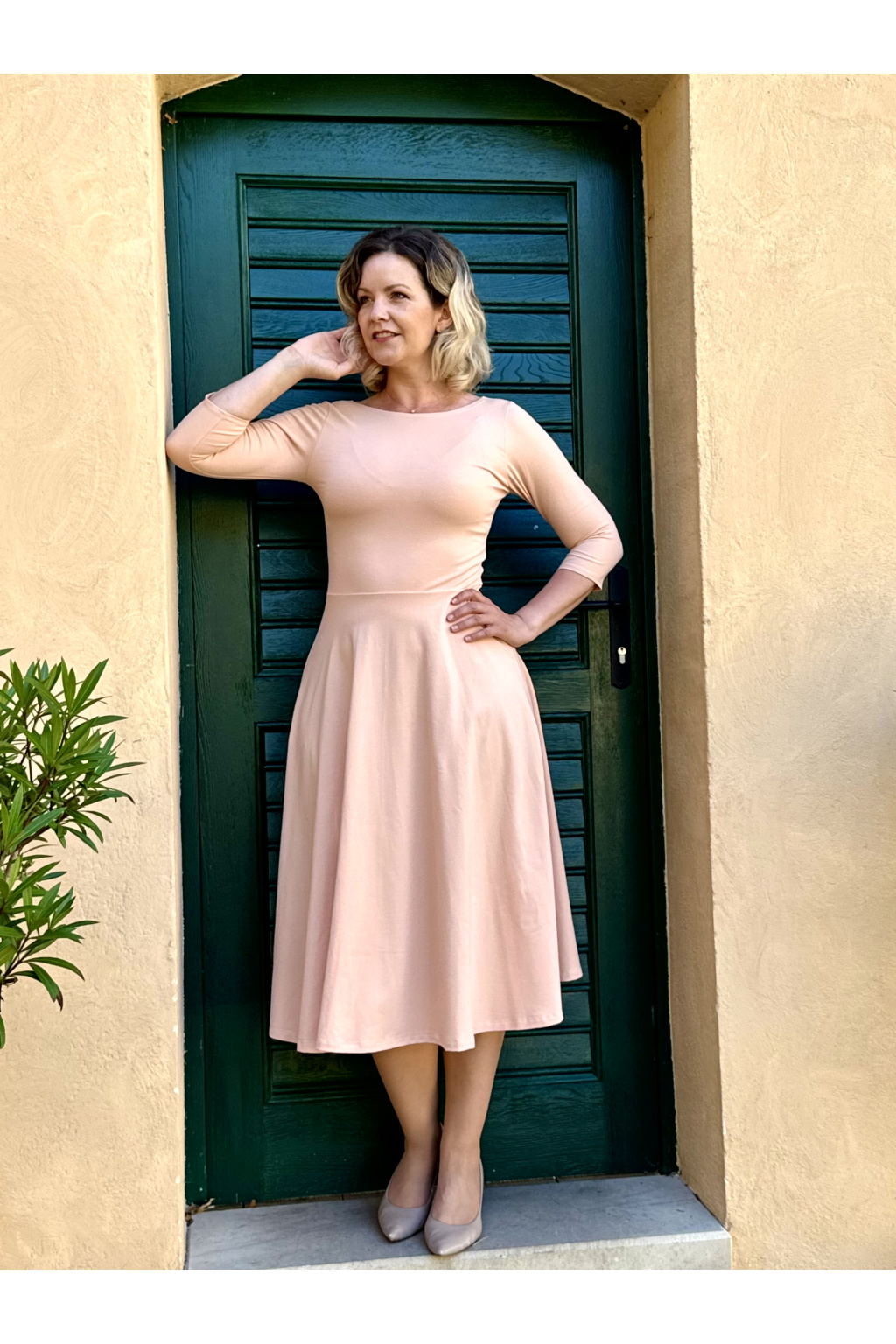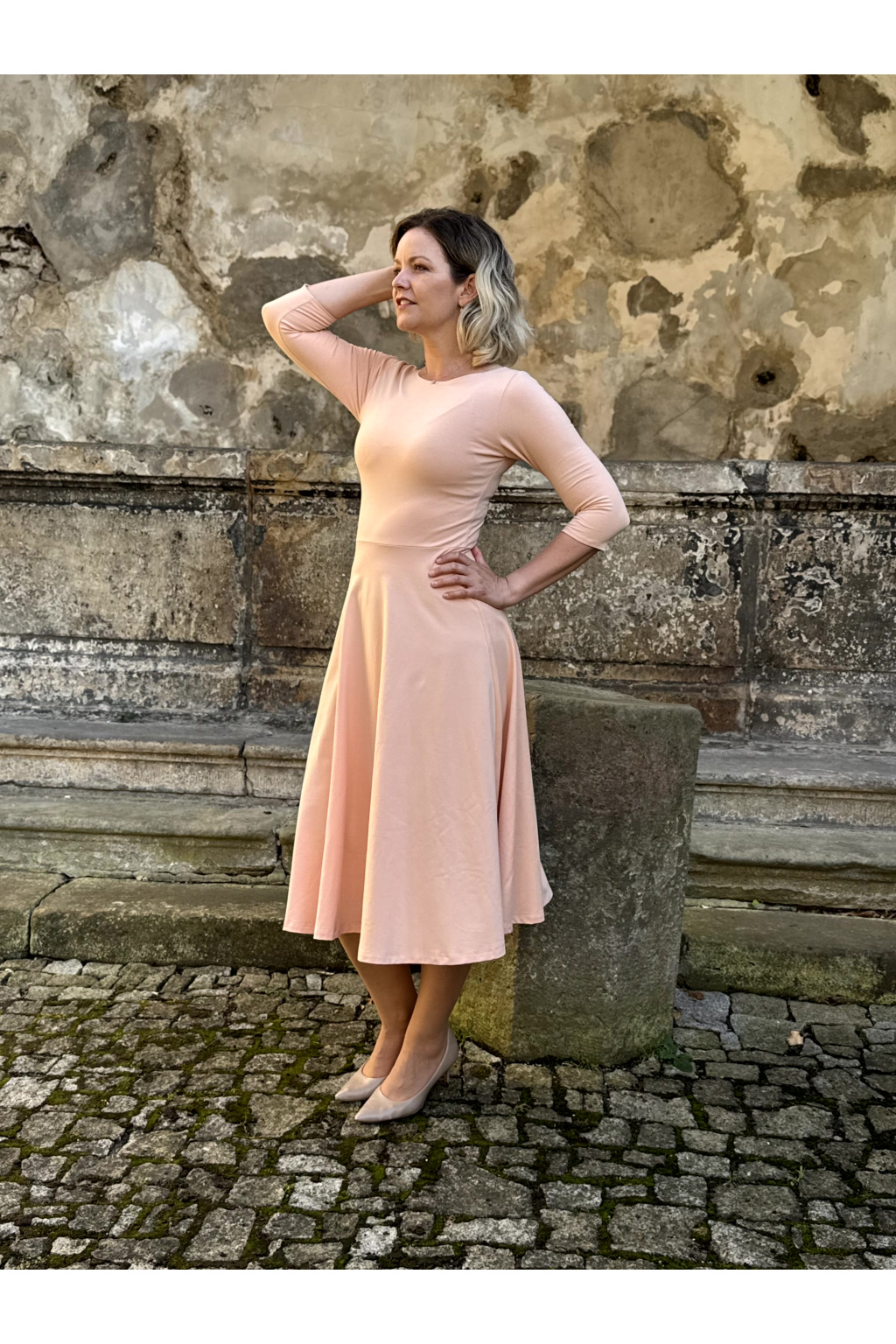 Modelka na fotce má na sobě: šaty ve velikosti XS, midi s délkou 120 cm, půlkolovou sukni, šaty mají lodičkový výstřih a 3/4 rukáv.