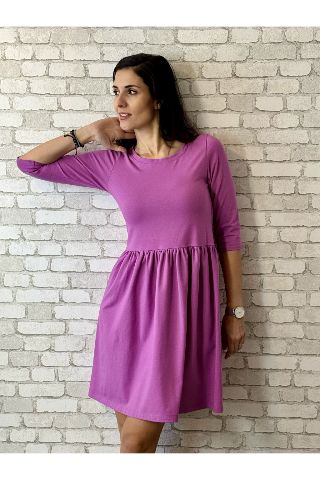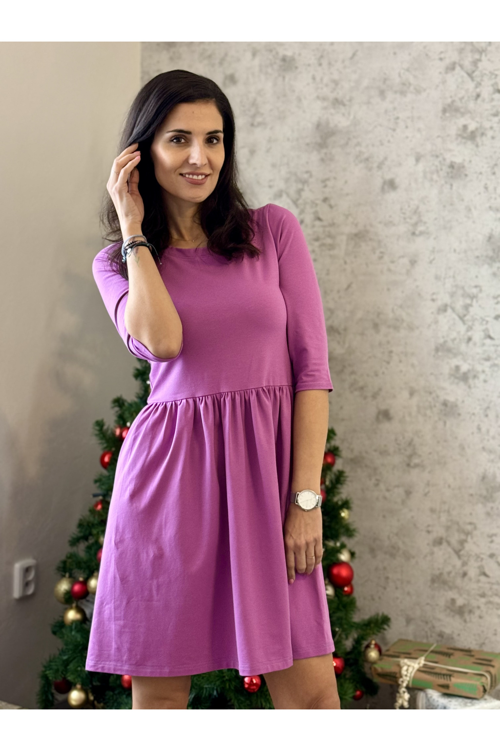 Modelka na fotce má na sobě: šaty vel. S, krátké s délkou 90 cm, řasenou sukni, kulatý výstřih, 3/4 rukáv, je vysoká 170 cm.