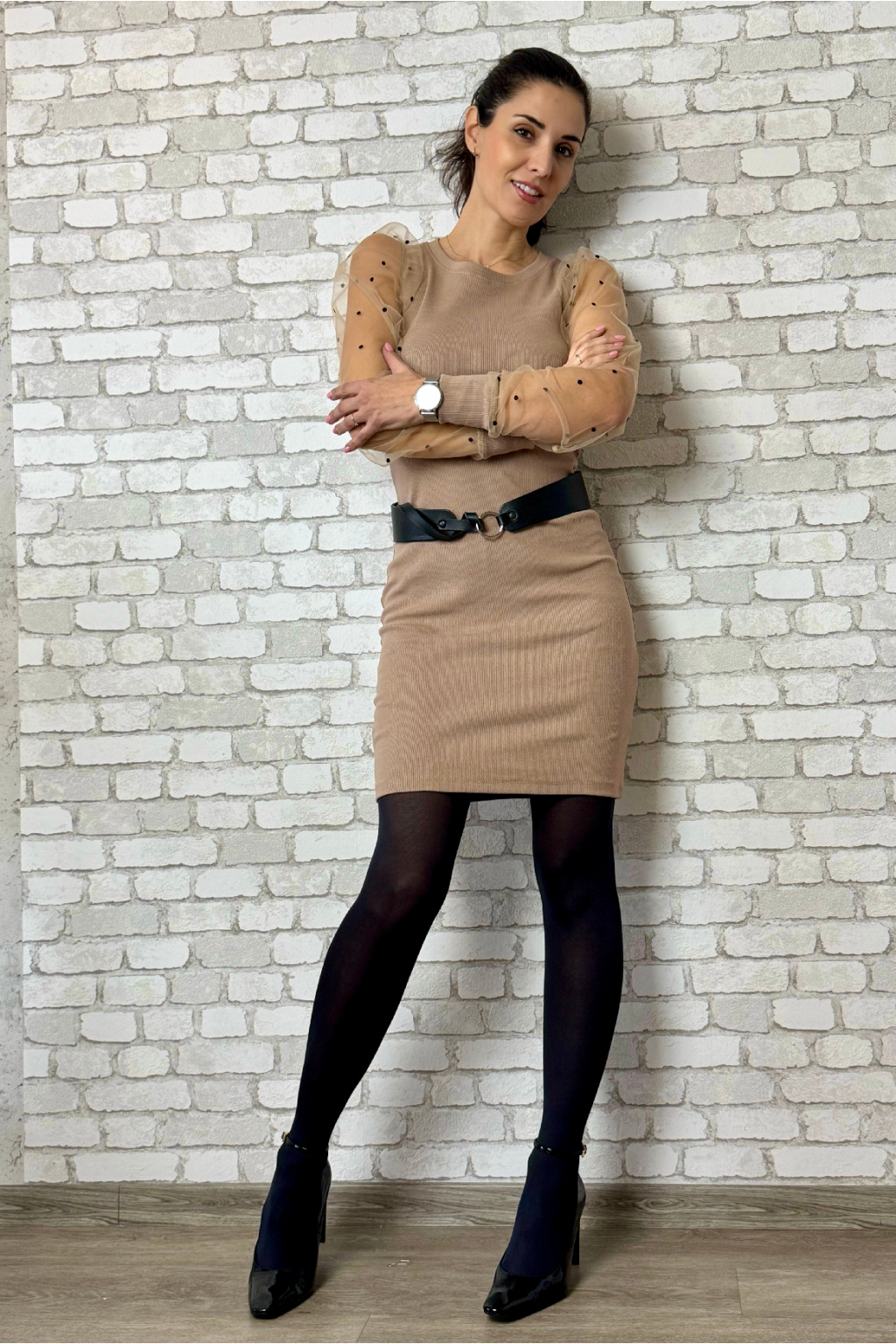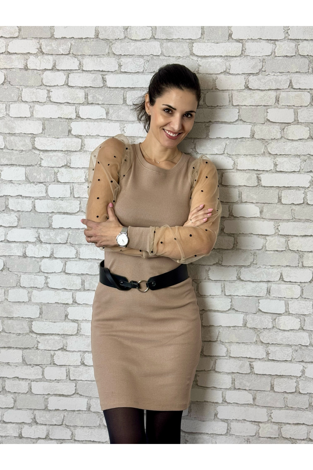 Modelka na fotce má na sobě: šaty vel. XS, krátké s délkou 95 cm, kulatý výstřih, je vysoká 170 cm.