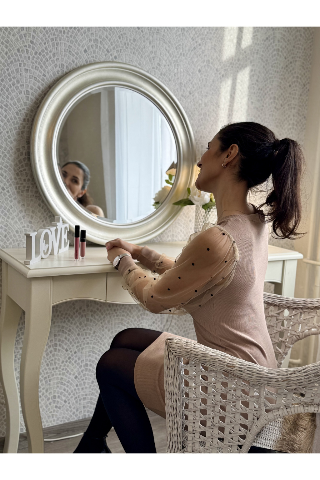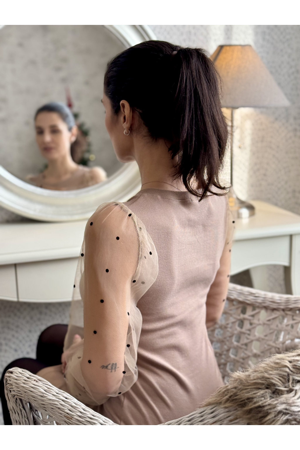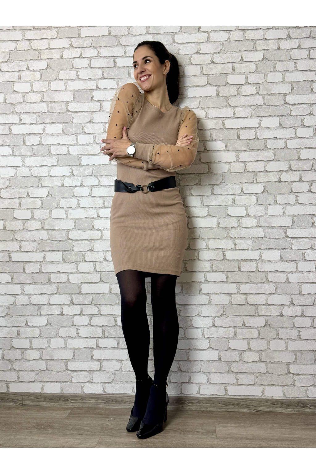 Bavlněné úzké žebrované šaty s tylem - světle hnědá - krátké 95 cm - vel. S - skladem