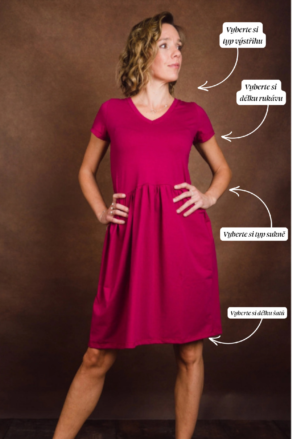 Typ sukně: řasená nebo půlkolová (na fotce má modelka sukni půlkolovou)
