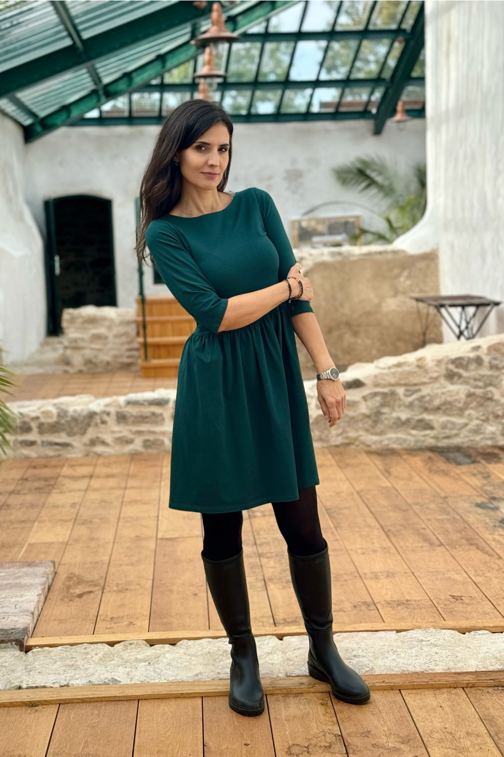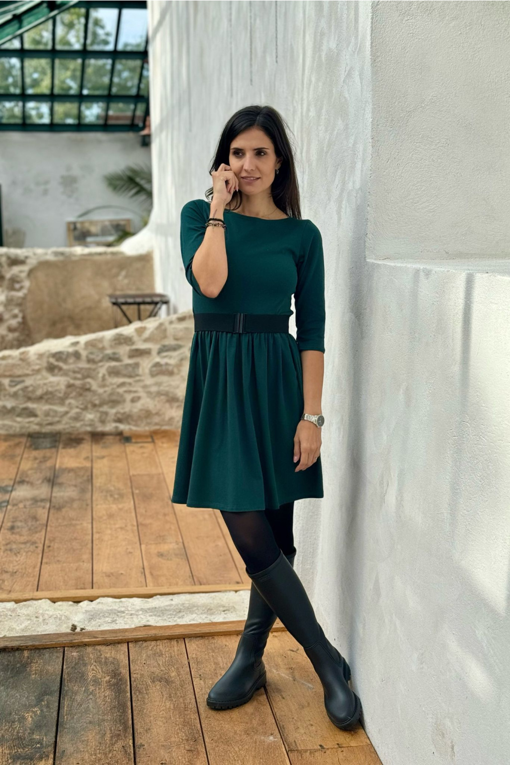 Modelka na fotce má na sobě: šaty vel. S, krátké s délkou 90cm, řasenou sukni, lodičkový výstřih, 3/4 rukáv, je vysoká 171 cm.