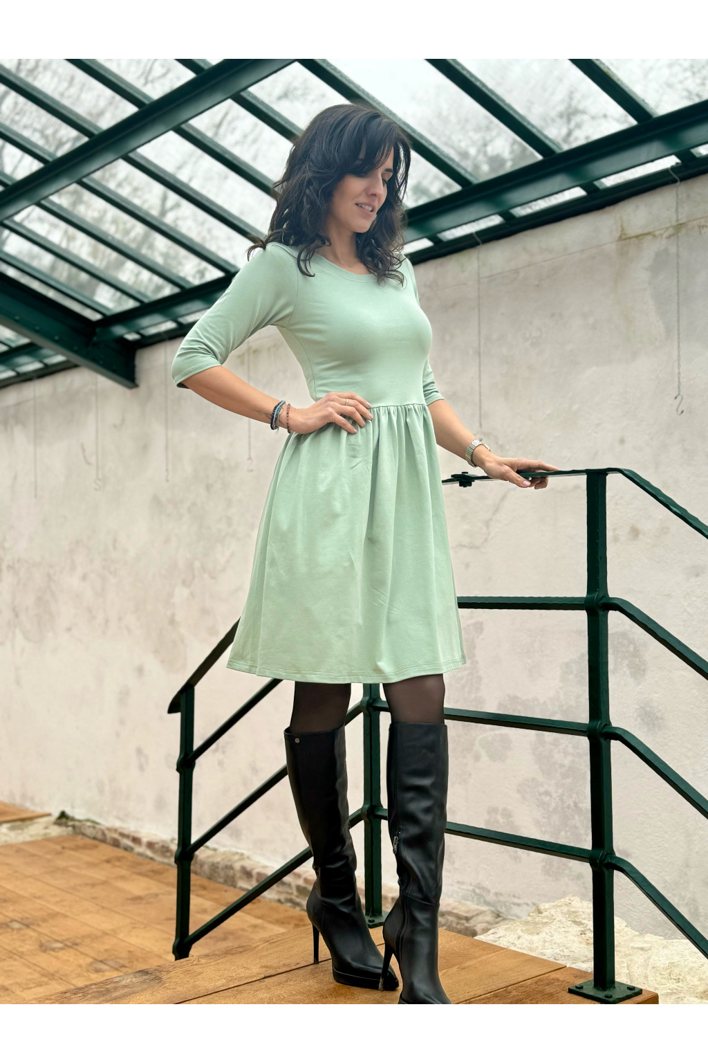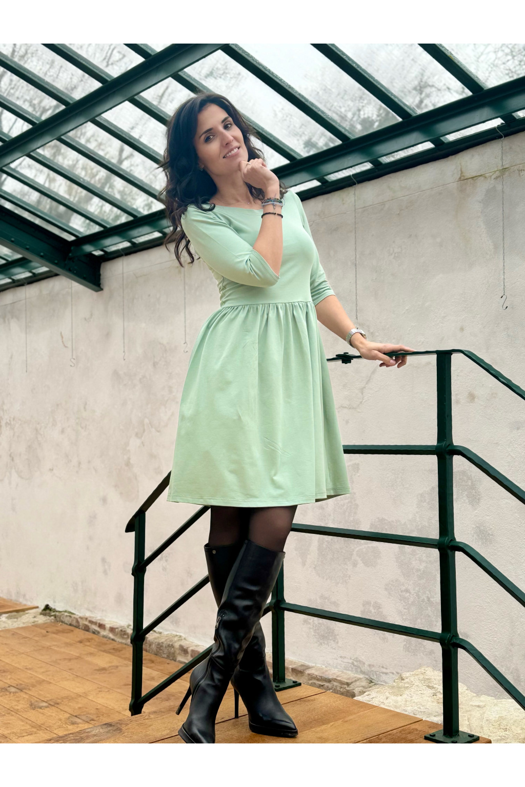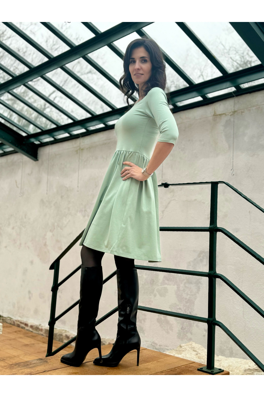 Modelka na fotce má na sobě: šaty vel. XS, krátké s délkou 95 cm, řasenou sukni, kulatý výstřih, 3/4 rukáv, je vysoká 170 cm.