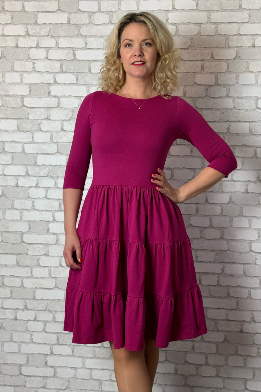 Bio bavlněné šaty řasené - cyklamenová - midi 120 cm - vel. XL - skladem