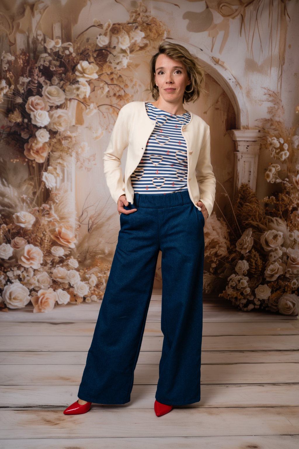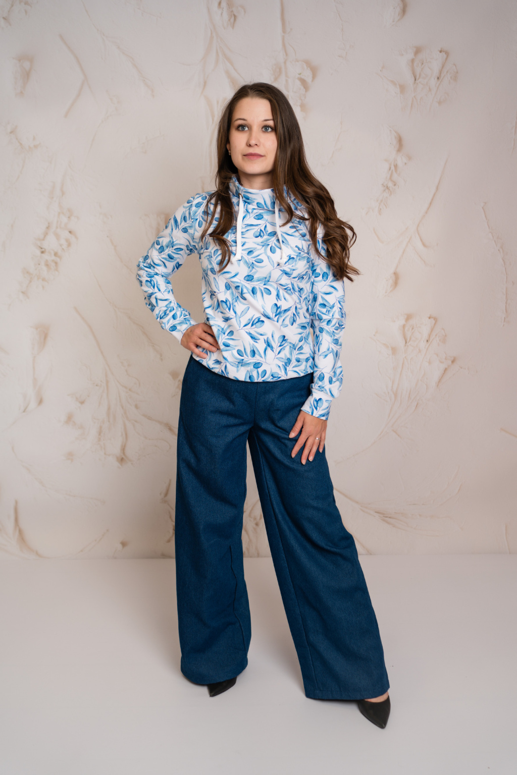 Modelka má na sobě: nohavice velkost XS s délkou 105 cm, je vysoká 167 cm.