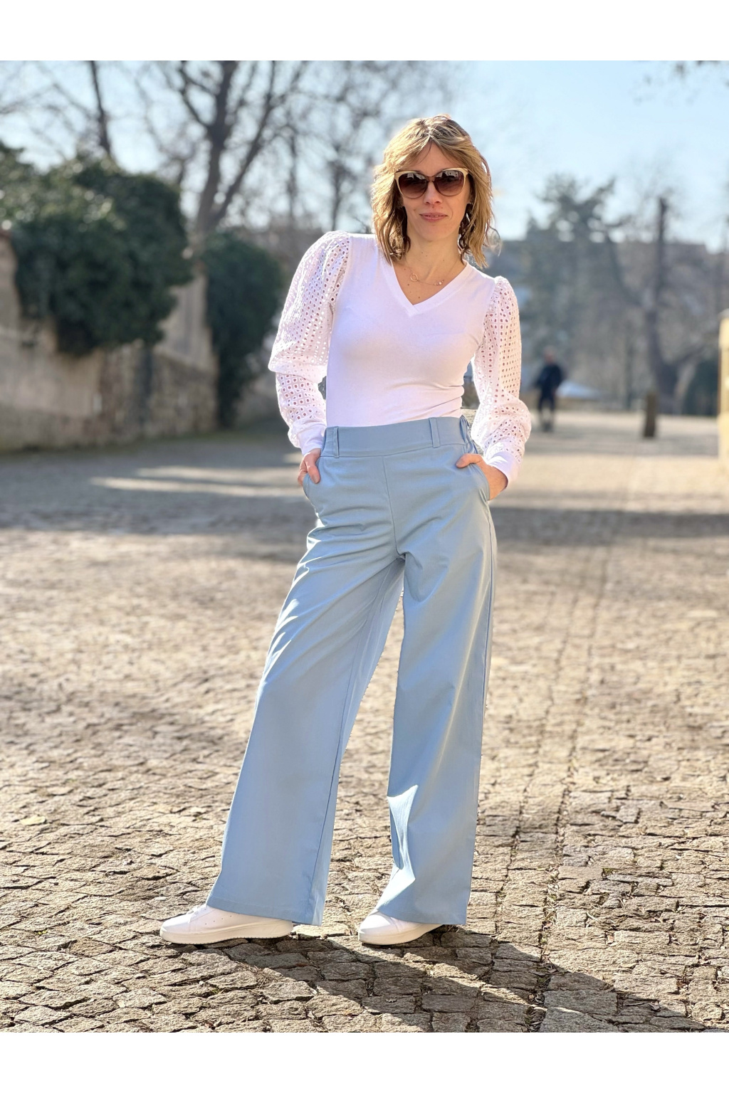 Bio bavlněné široké kalhoty - dlouhé - světle modrá - vel. S - 110 cm - skladem