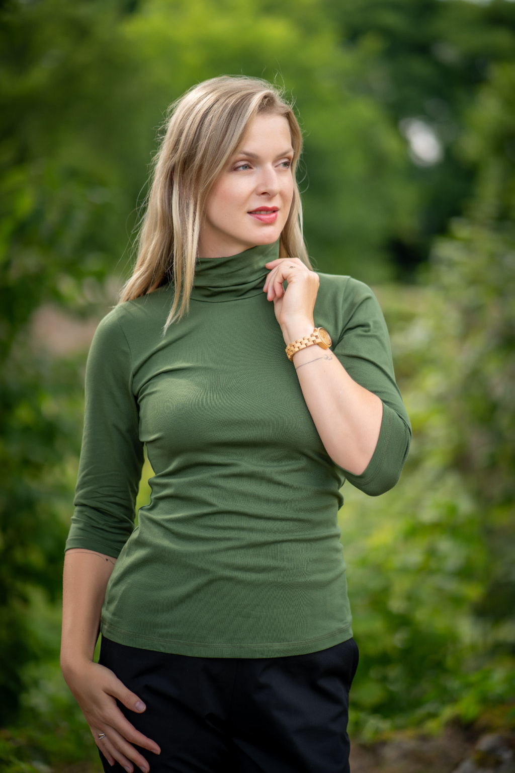 Modelka na fotce má na sobě: rolák vel. S, 3/4 rukáv.
