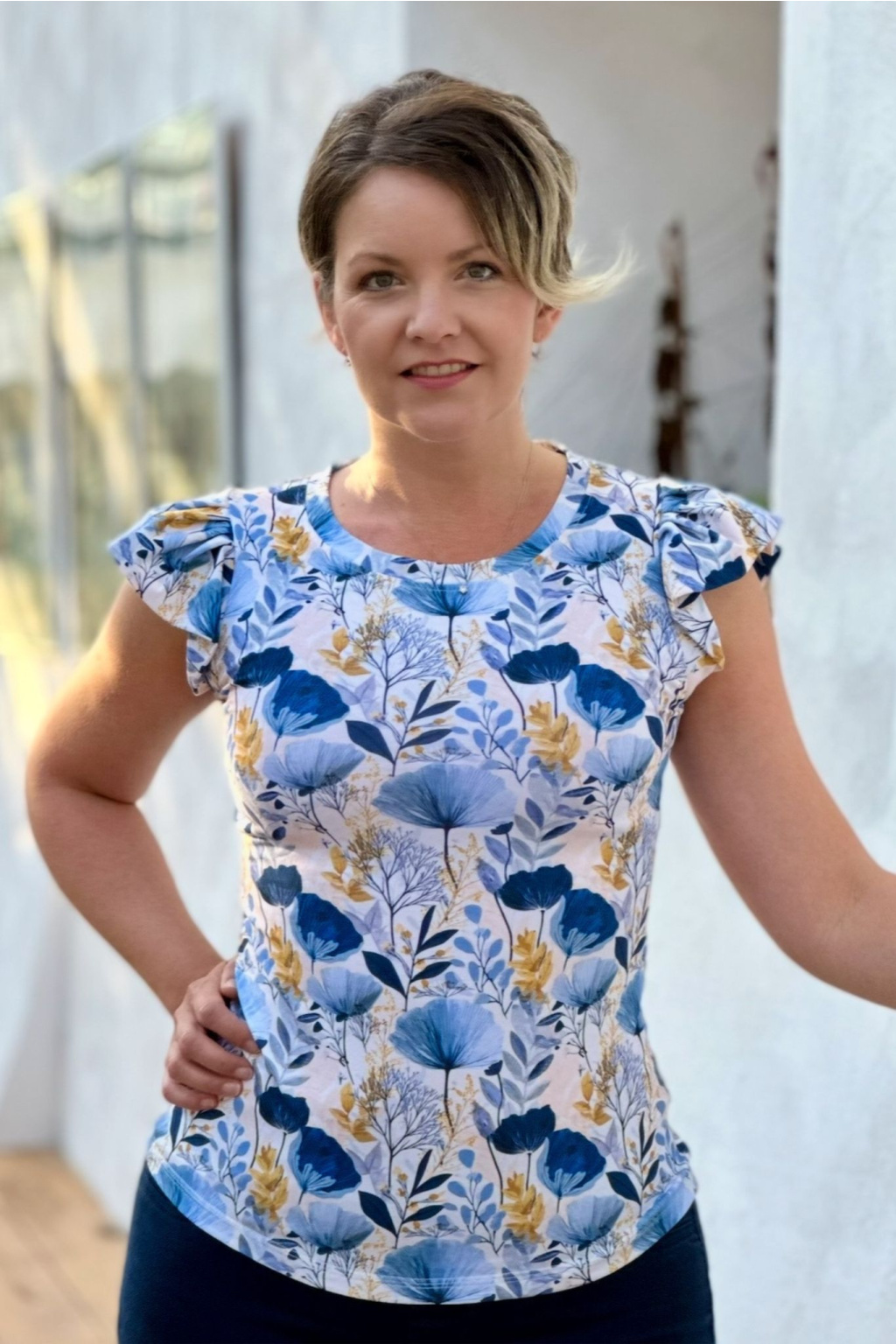 Modelka na fotce má na sobě: vel. S, kulatý výstřih.