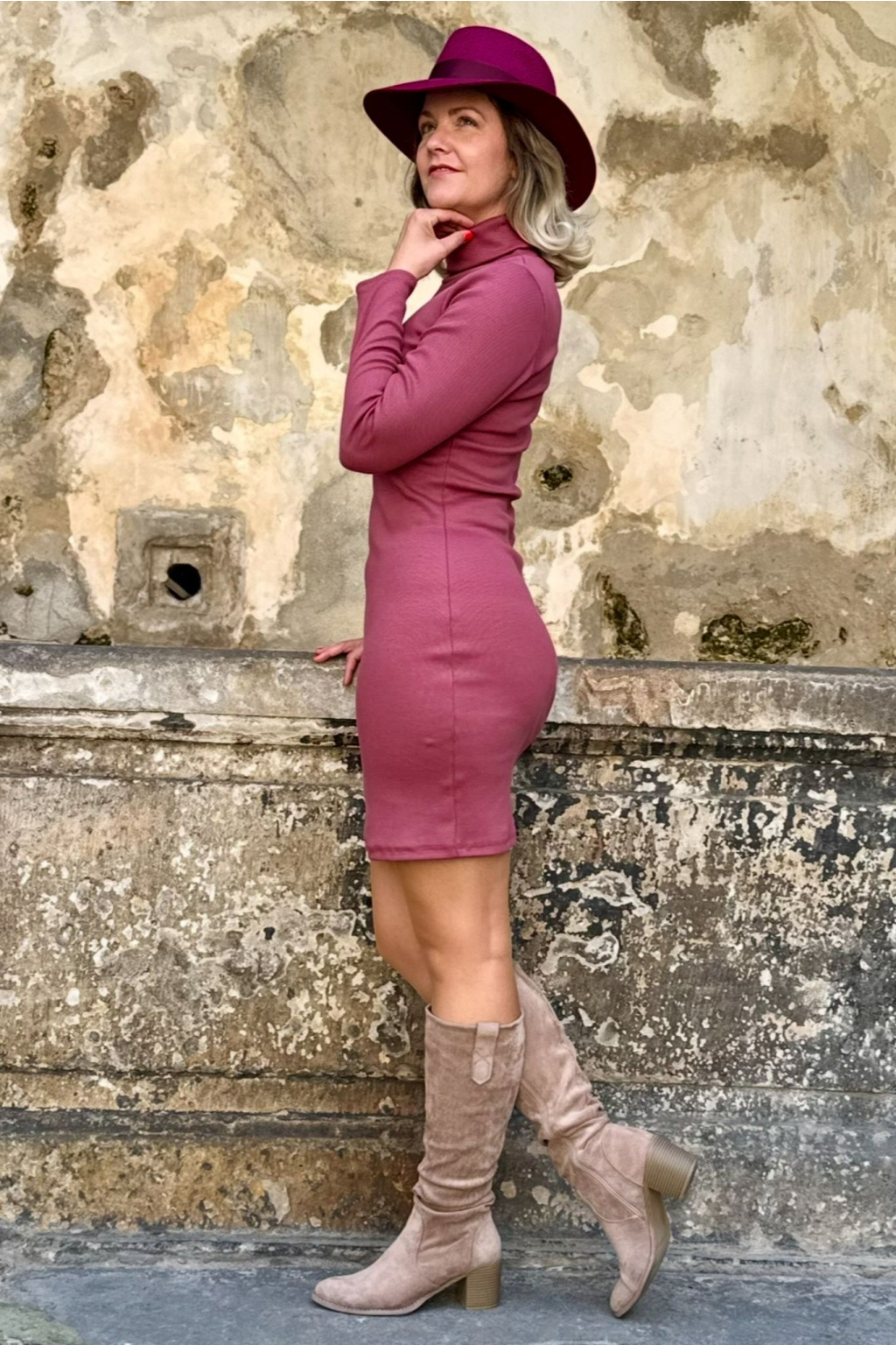 Hrubší úzké žebrované šaty Gill - rosewood - krátké 95 cm - vel. XS - skladem