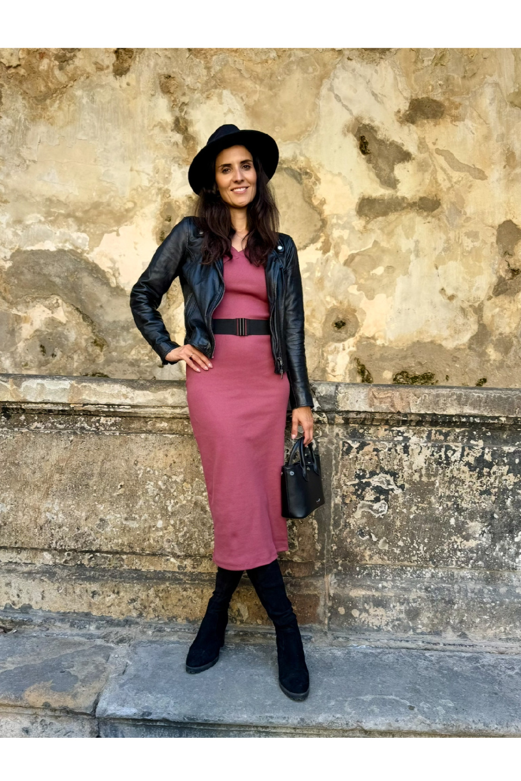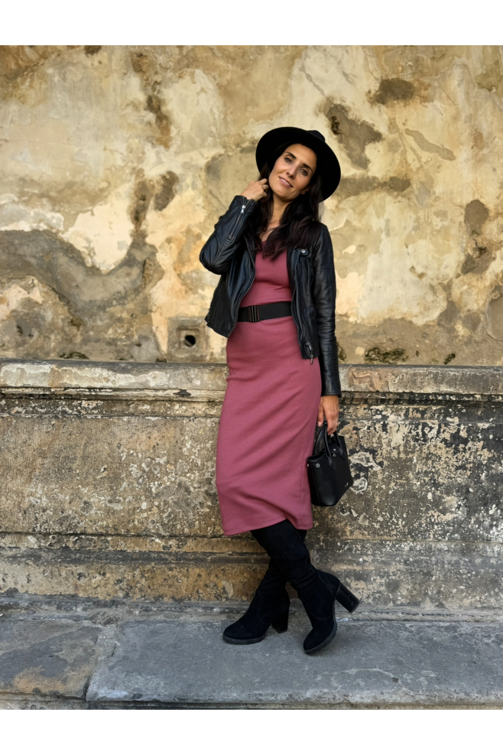 Hrubší úzké žebrované šaty Klasik - rosewood - midi 120 cm - vel. M - skladem