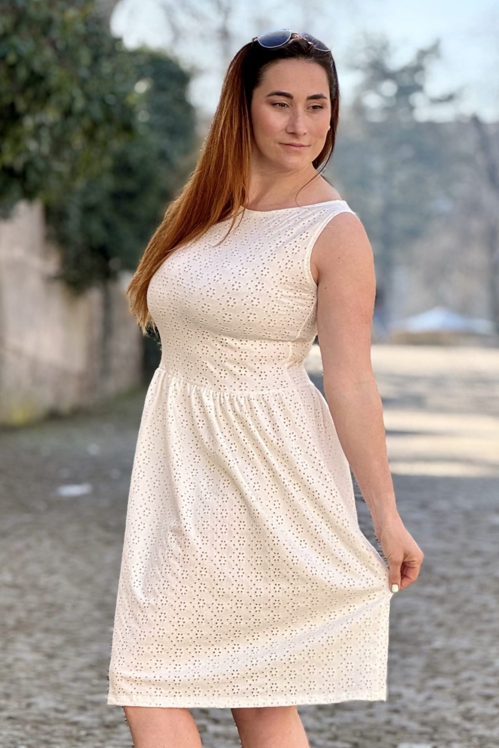 Oboustranné madeirové šaty Ava - hlubší kulatý výstřih - smetanová - krátké 95 cm - vel. XS - skladem