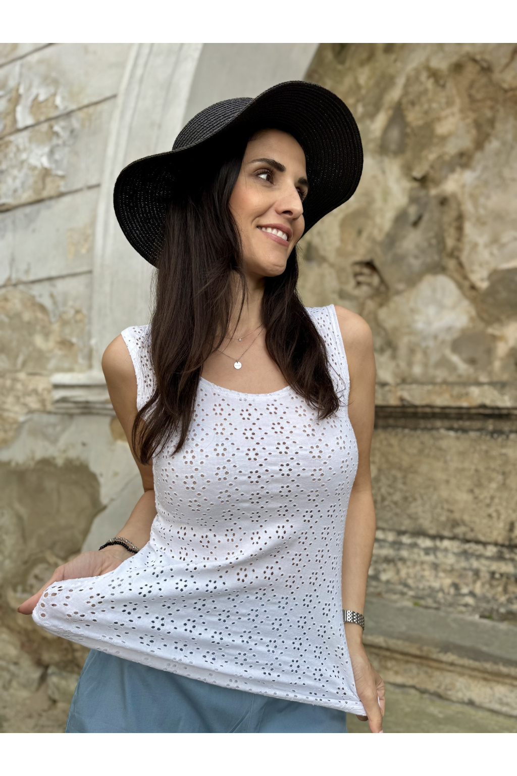 Výstřih: lodičkový výstřih na jedné straně, hlubší kulatý na druhé – model je oboustranný