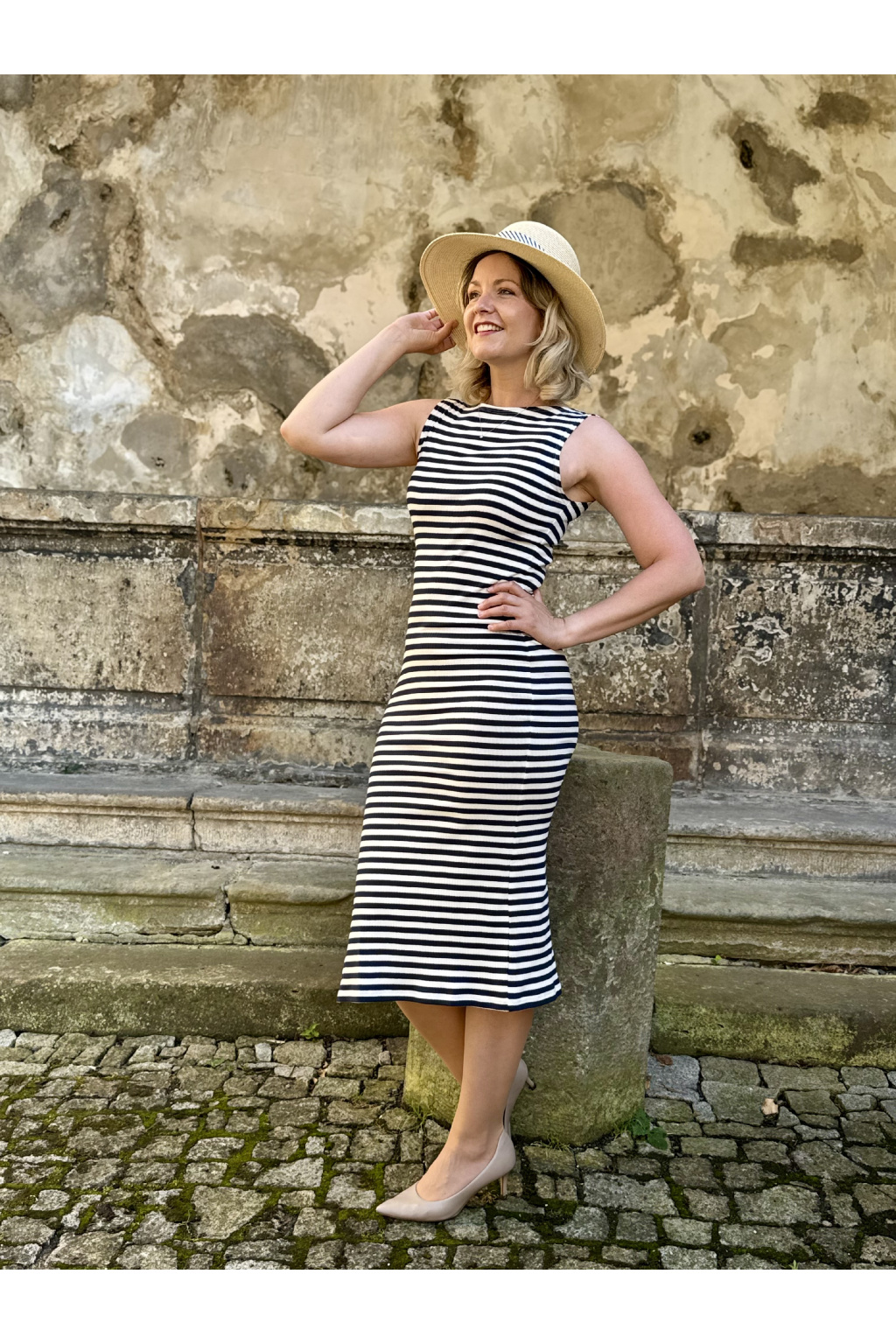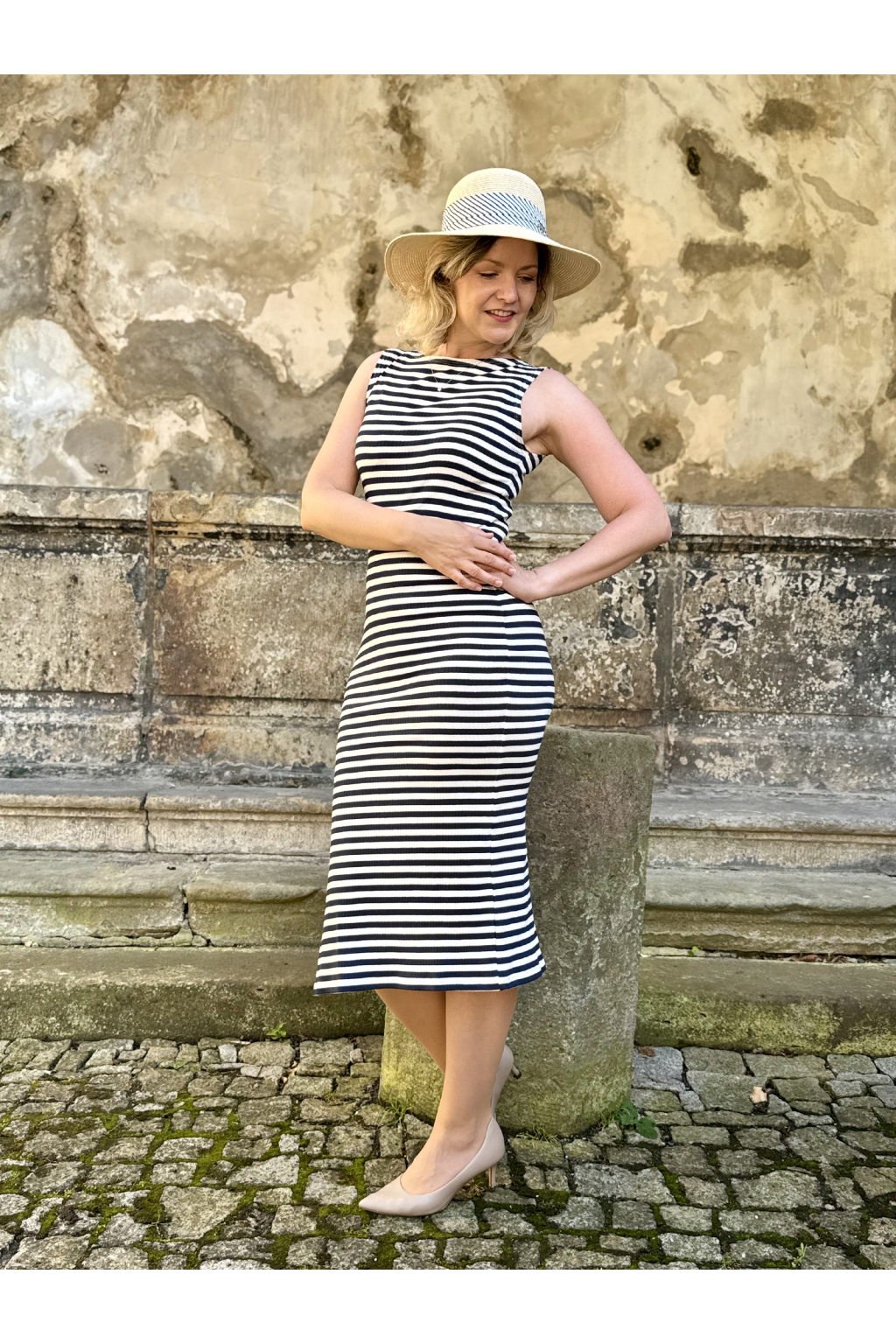 Proužkované úzké šaty - oboustranné - modro-smetanová - vel. XS - 120 cm - skladem