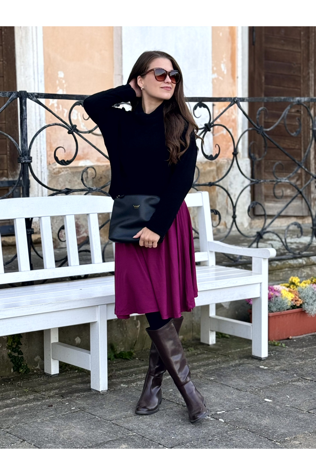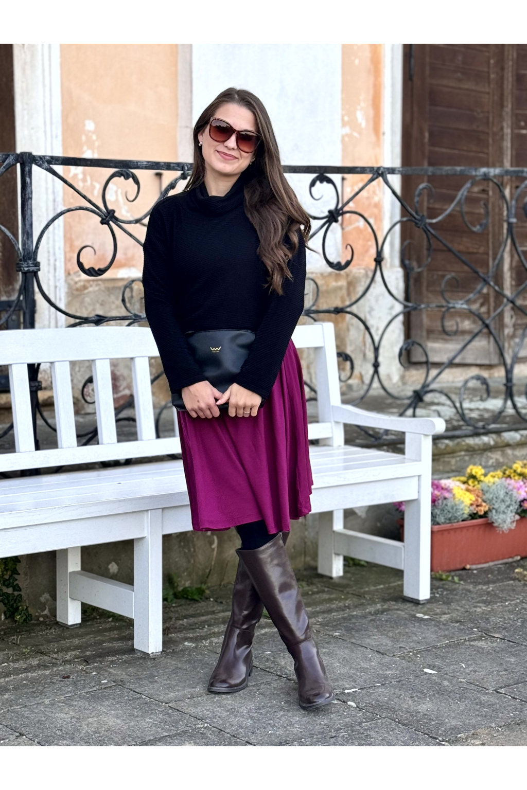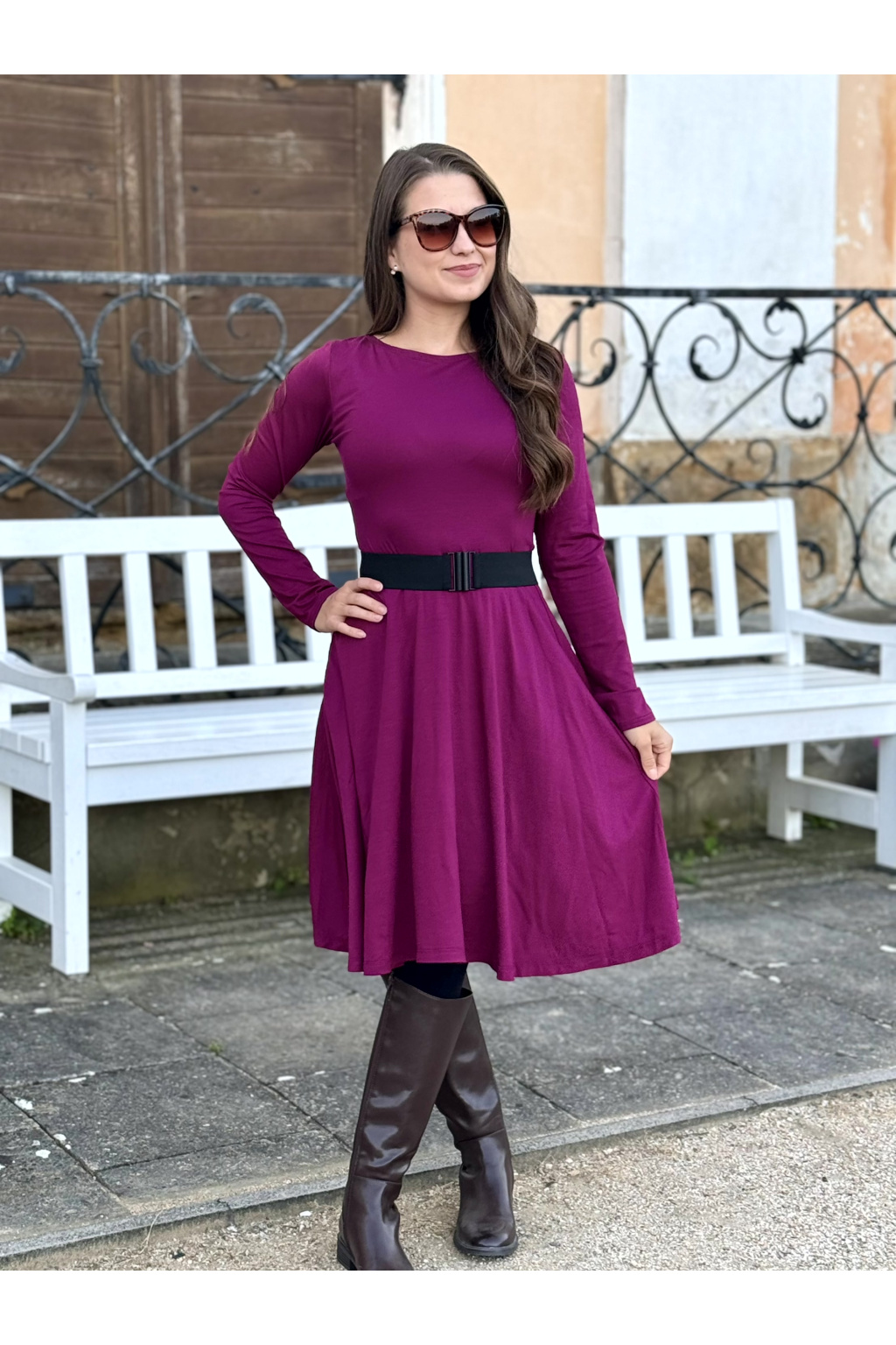 Modelka na fotce má na sobě: šaty vel. XS, krátké s délkou 95 cm, půlkolovou sukně, lodičkový výstřih, dlouhý rukáv, je vysoká 159 cm.