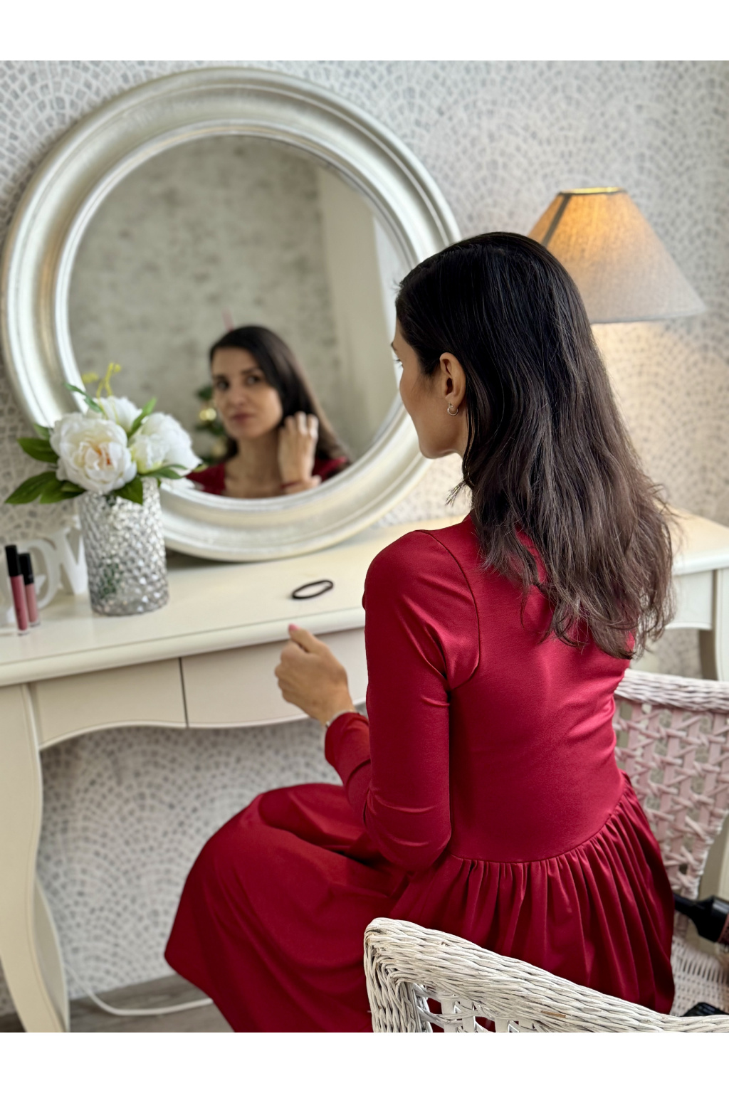 Modelka na fotce má na sobě: šaty vel. S, krátké s délkou 95 cm, řasenou sukni, kulatý výstřih, 3/4 rukáv, je vysoká 171 cm.