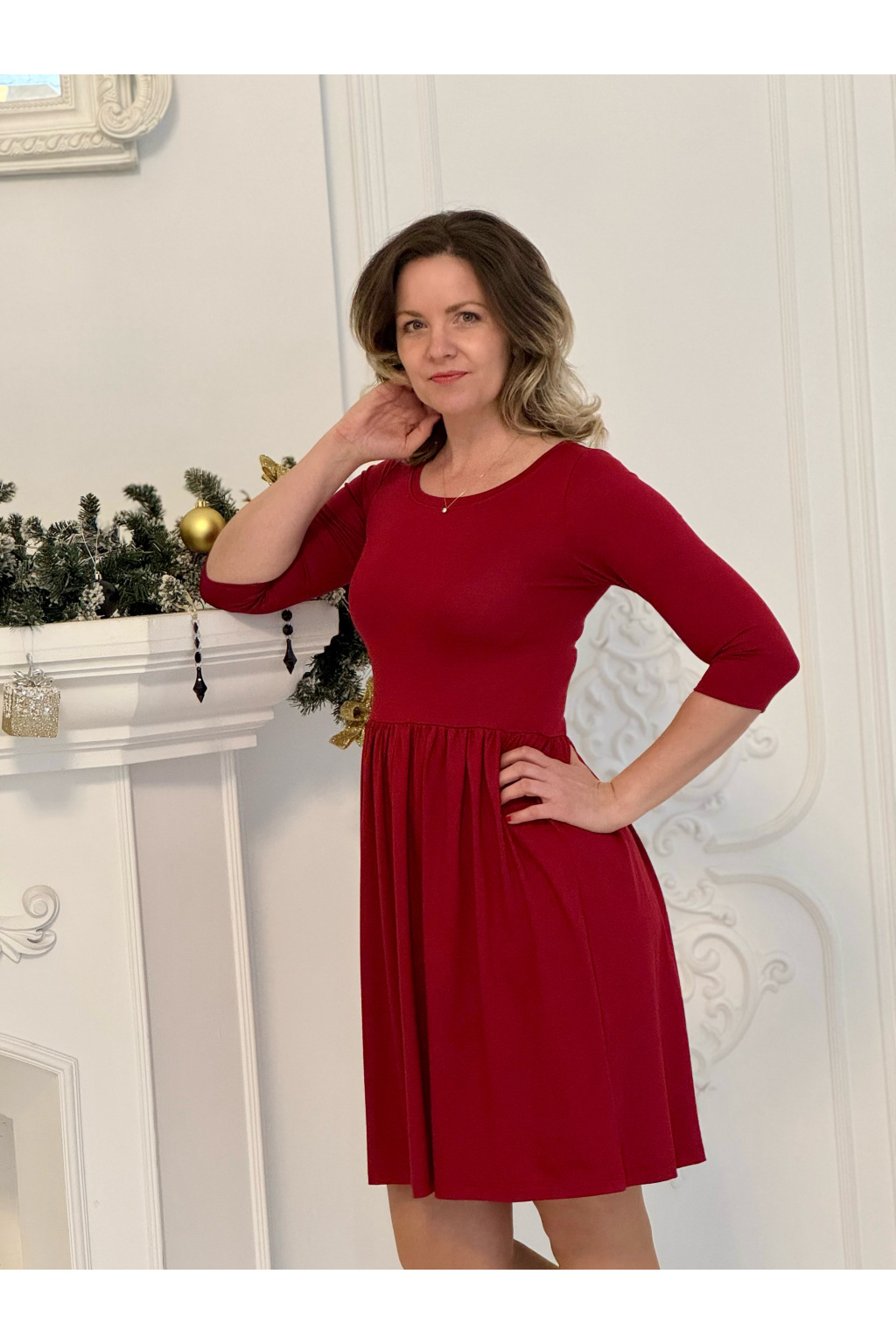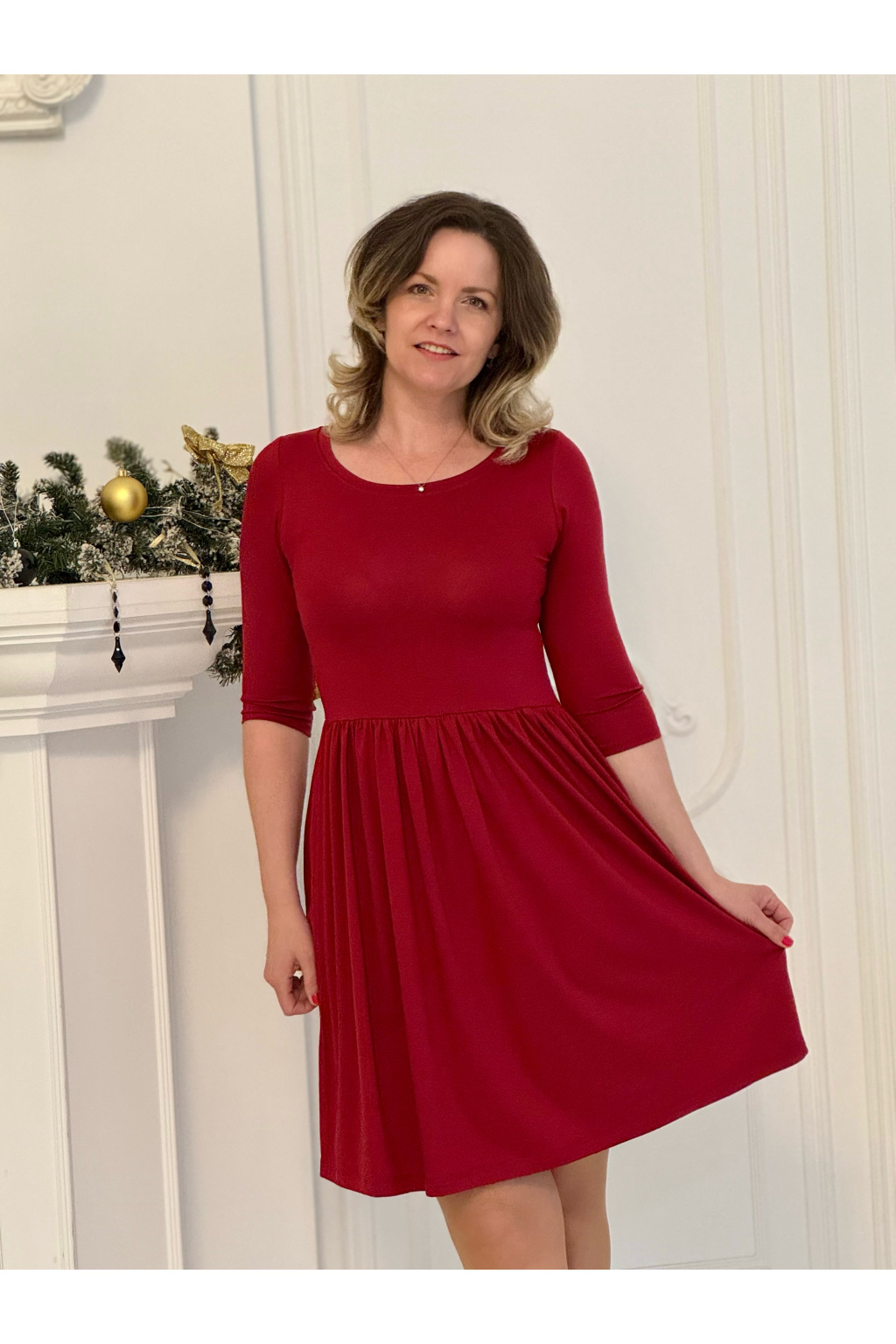 Modelka na fotce má na sobě: šaty vel. XS, krátké s délkou 90 cm, řasenou sukni, kulatý výstřih, 3/4 rukáv, je vysoká 171 cm.
