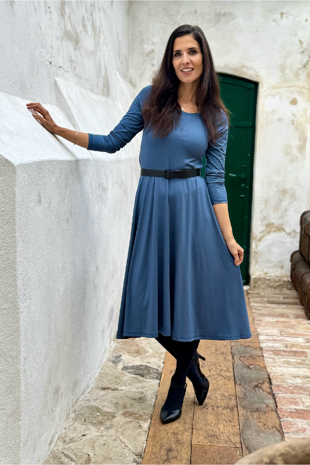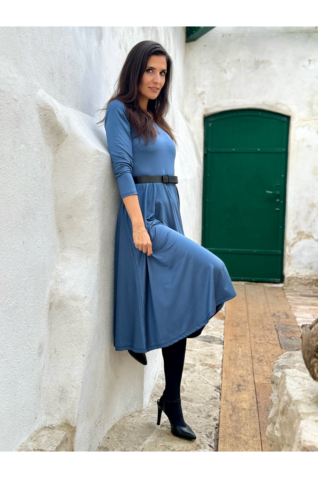 Modelka na fotce má na sobě: šaty vel. S, midi s délkou 110 cm, půlkolovou sukni, kulatý výstřih, dlouhý rukáv. Šaty vel. XS, krátké s délkou 95 cm, řasenou sukni, véčkový výstřih, 3/4 rukáv.