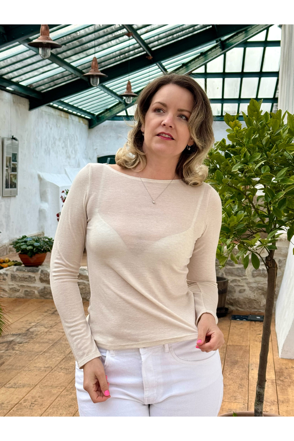 Modelka na fotce má na sobě: vel. S, lodičkový výstřih, dlouhý rukáv.