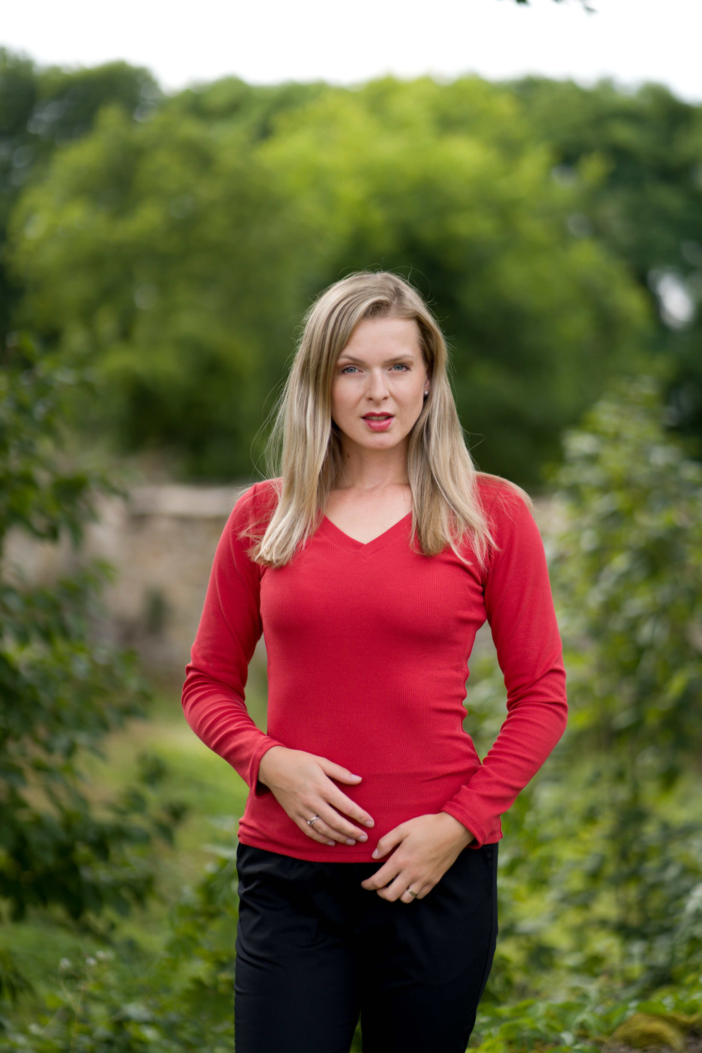 Modelka na fotce má na sobě: tričko vel. XS, V-čkový výstřih, dlouhý rukáv.