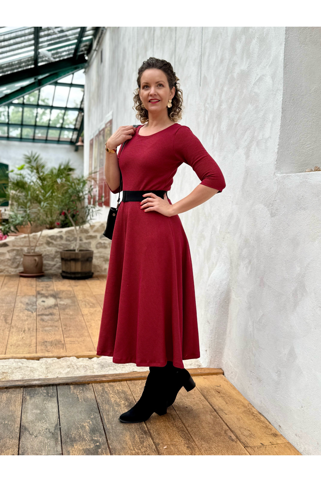 Modelka na fotce má na sobě: šaty vel. S, midi s délkou 120 cm, půlkolovou sukni, kulatý výstřih, 3/4 rukáv, je vysoká 171 cm.