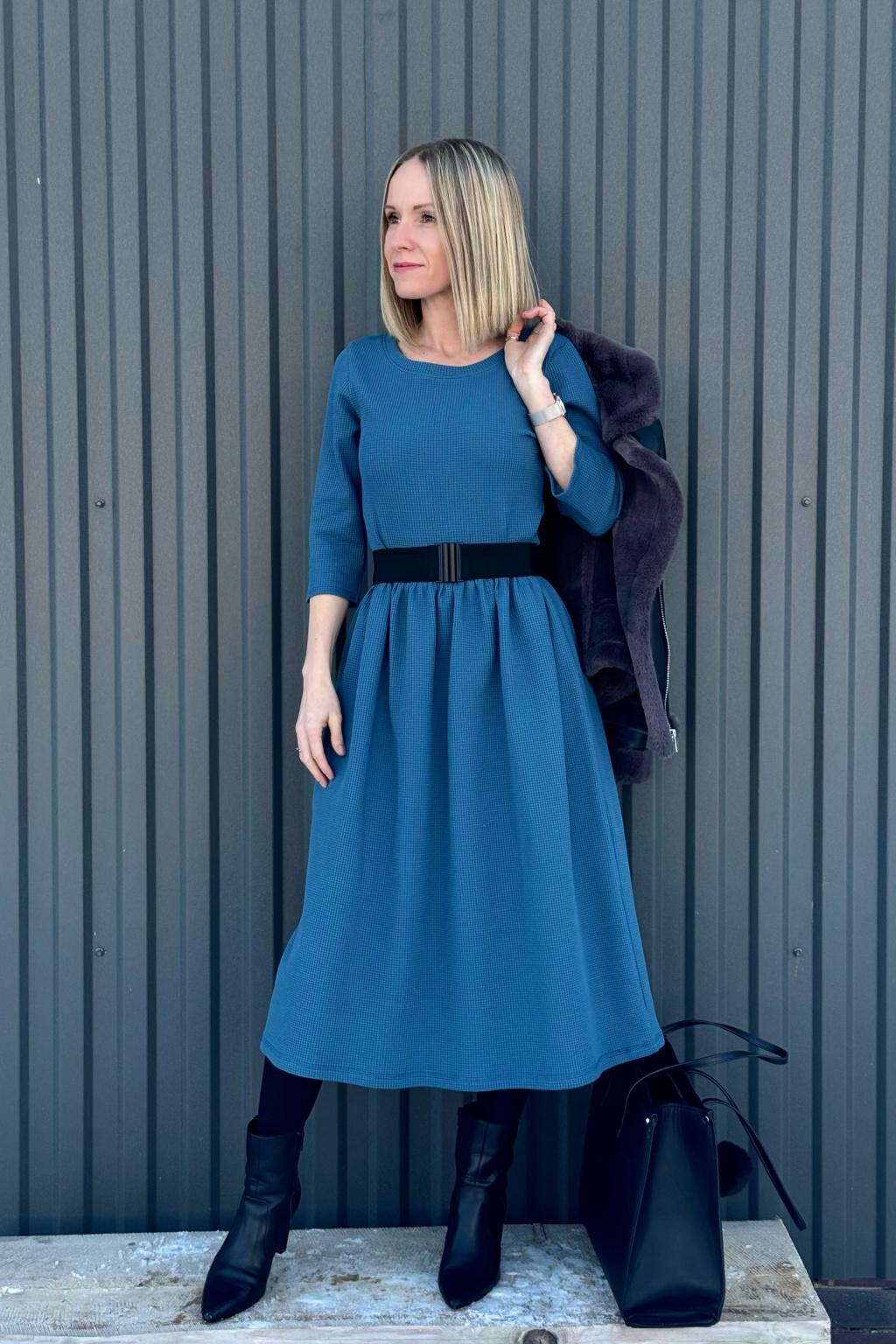 Modelka na fotce má na sobě: šaty vel. XS, v midi délce 110 cm, řasenou sukni, kulatý výstřih, 3/4 rukáv, je vysoká 159 cm.