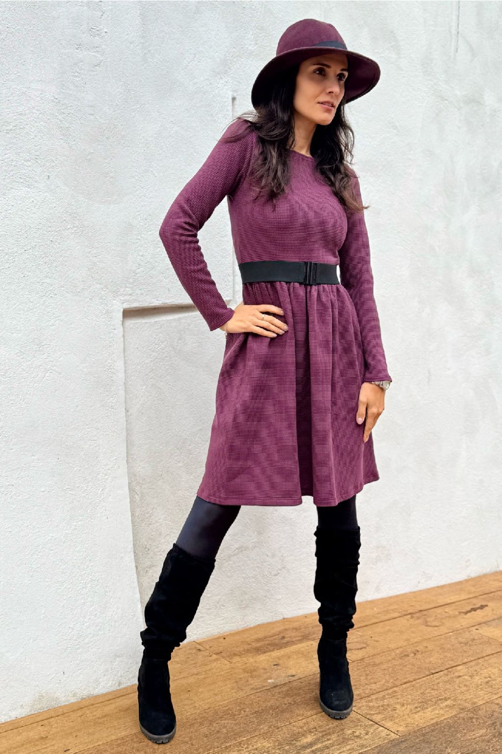 Vaflové bio bavlněné šaty Klasik - Zarina - vínová - midi 120 cm - vel. XXS - skladem