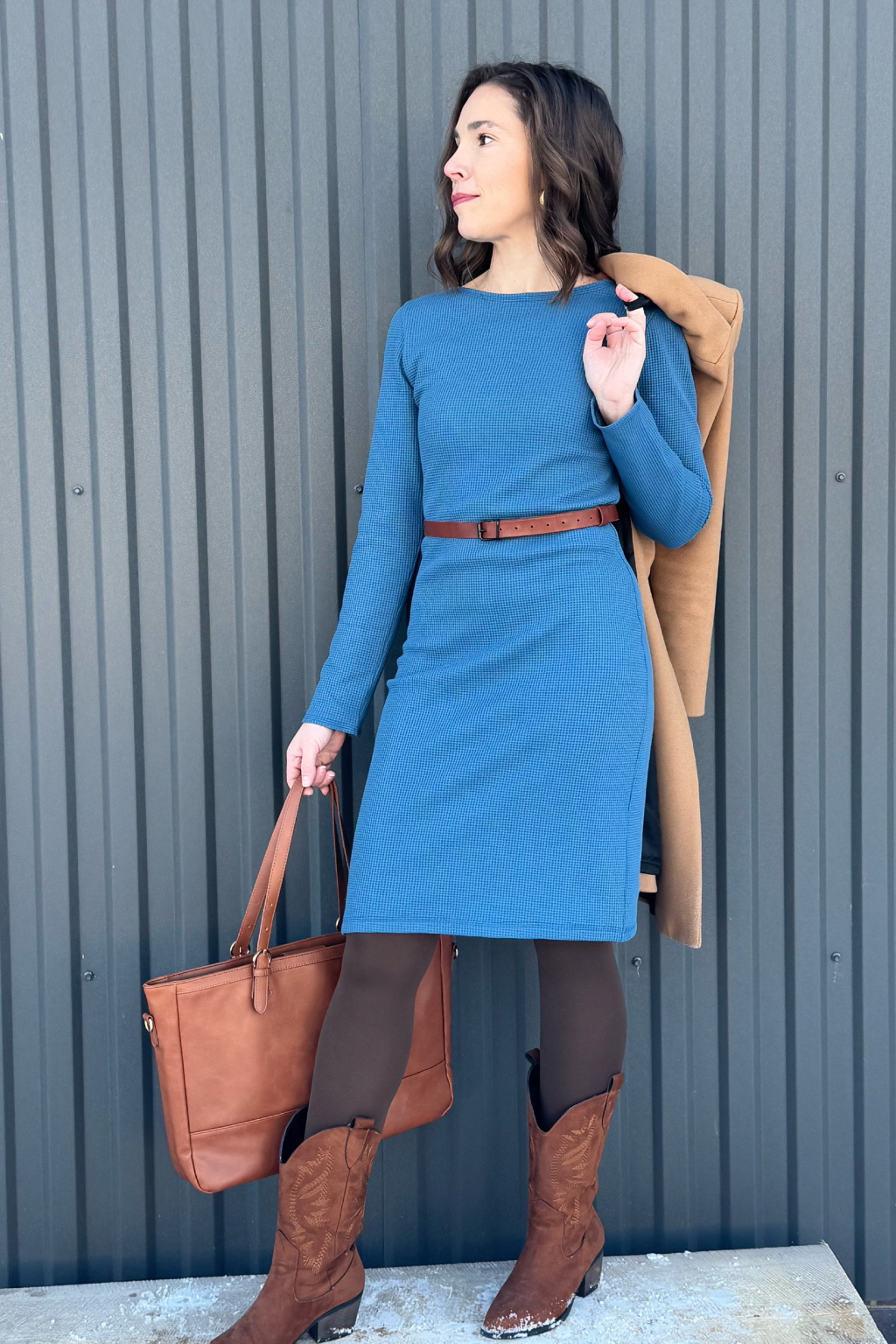 Vaflové bio bavlněné úzké šaty - Zarina - džínová modrá - krátké 95 cm - vel. L - skladem