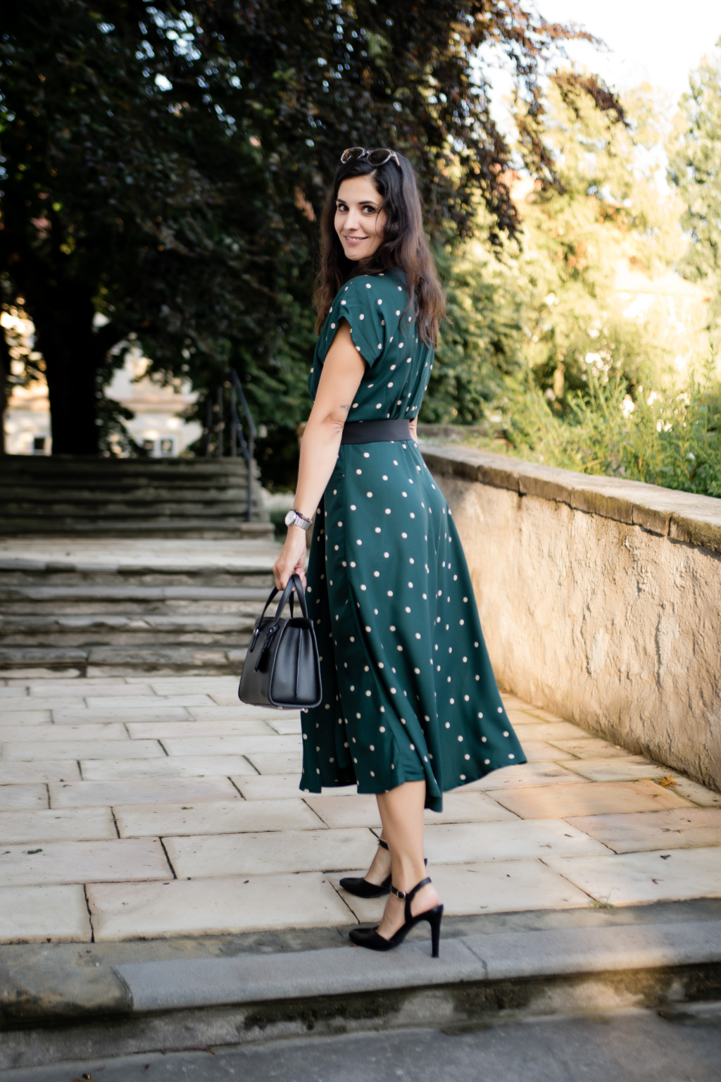 Zavinovací šaty - puntíkaté - lahvově zelená - EcoVero viskóza - midi - vel. XXS - 120 cm - skladem