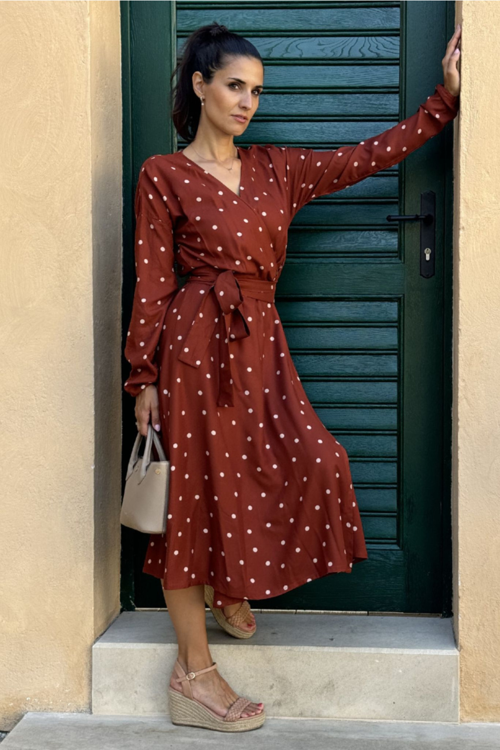 Zavinovací šaty - puntíkaté - rezavá - EcoVero viskóza - midi 120 cm - vel. S - skladem