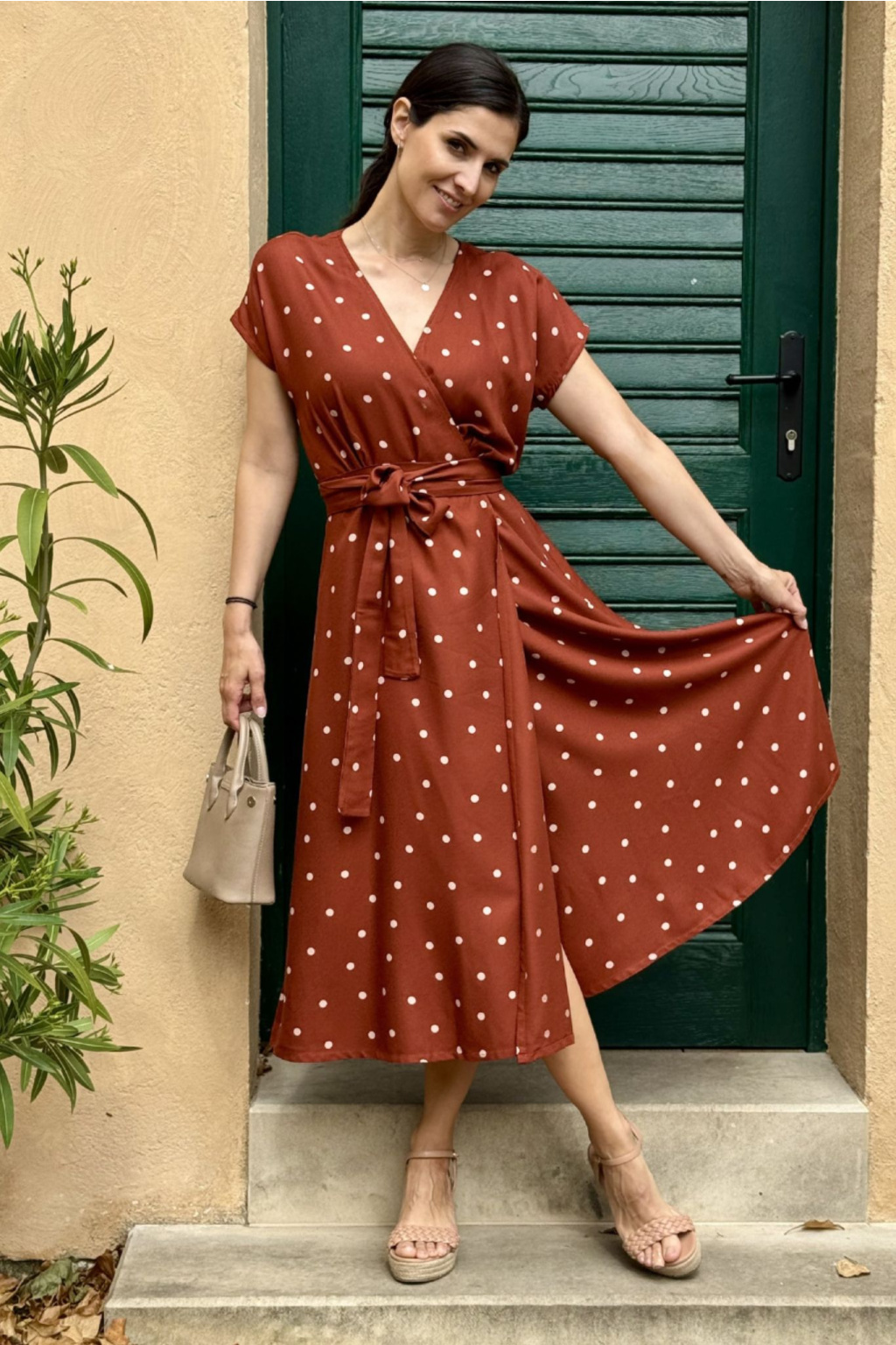Zavinovací šaty - puntíkaté - rezavá - EcoVero viskóza - midi 120 cm - vel. S - skladem