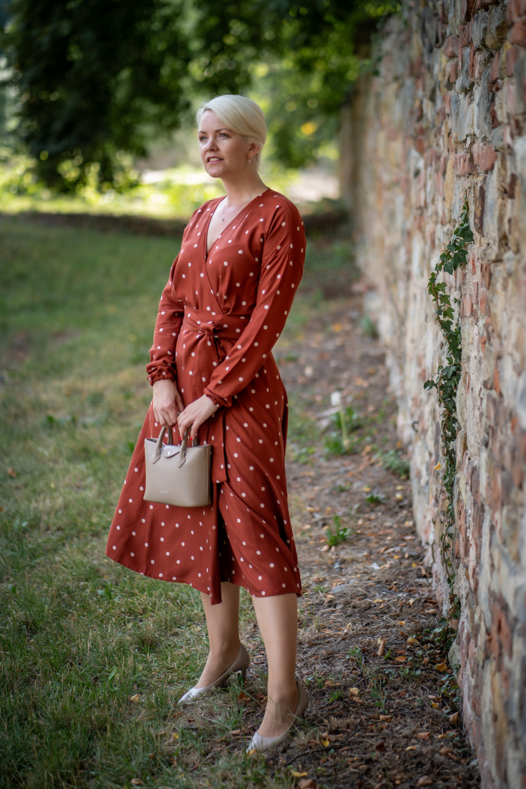 Zavinovací šaty - puntíkaté - rezavá - EcoVero viskóza - krátké 100 cm - vel. M - skladem