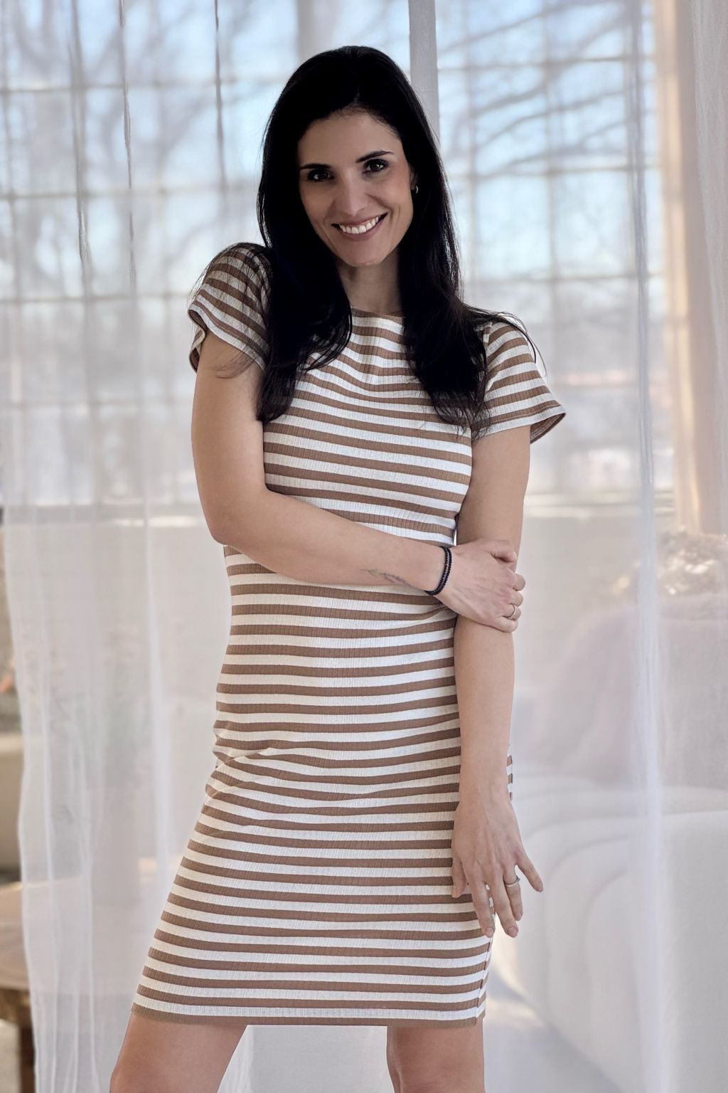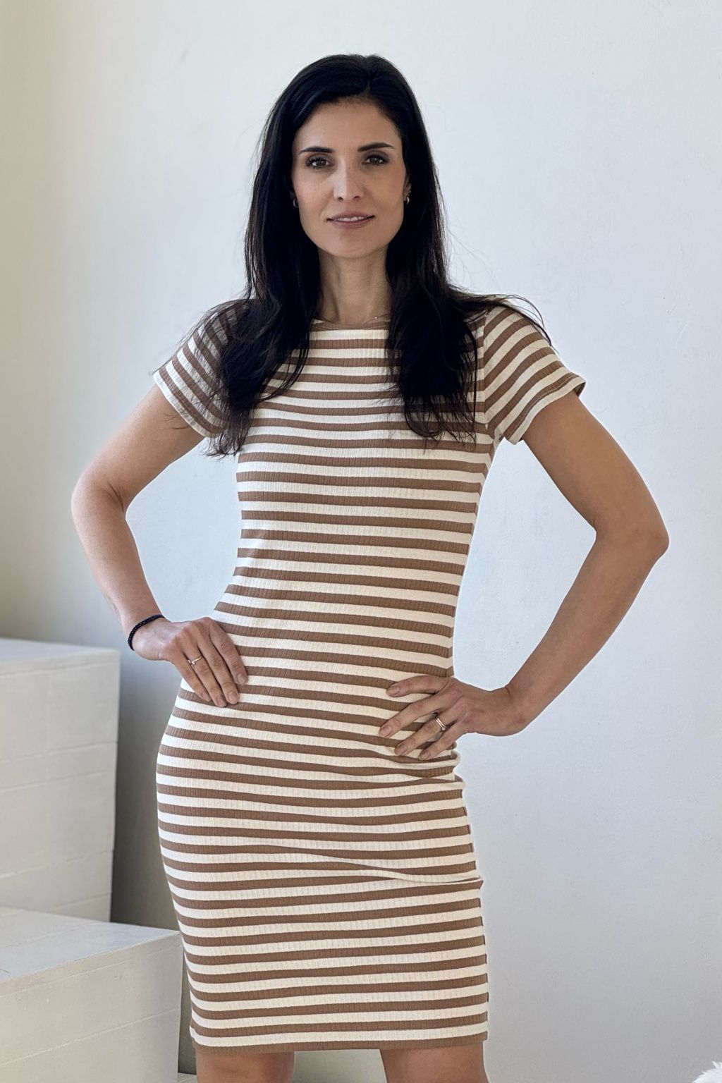 Proužkované úzké šaty Klasik - mocha - smetanová - krátké