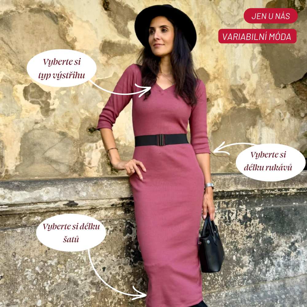 Modelka na fotce má na sobě: šaty vel. XXS, midi s délkou 120 cm, V-čkový výstřih, 3/4 rukáv, je vysoká 170 cm.