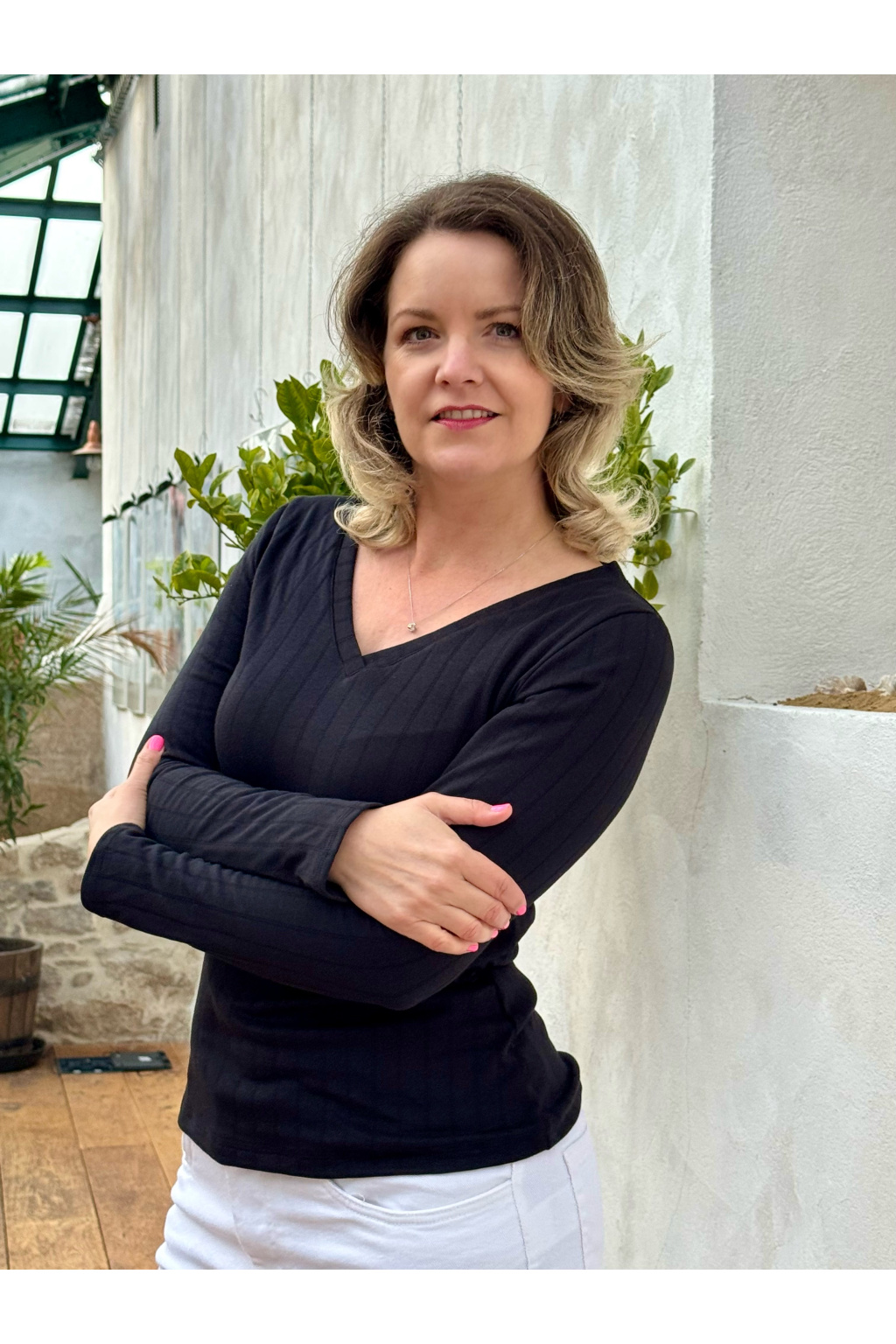 Modelka má na sobě: tričko vel. M, véčkový výstřih, dlouhý rukáv.