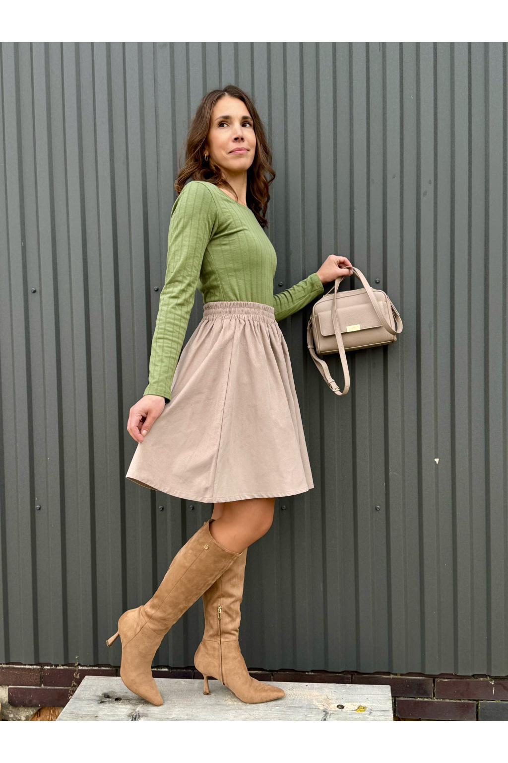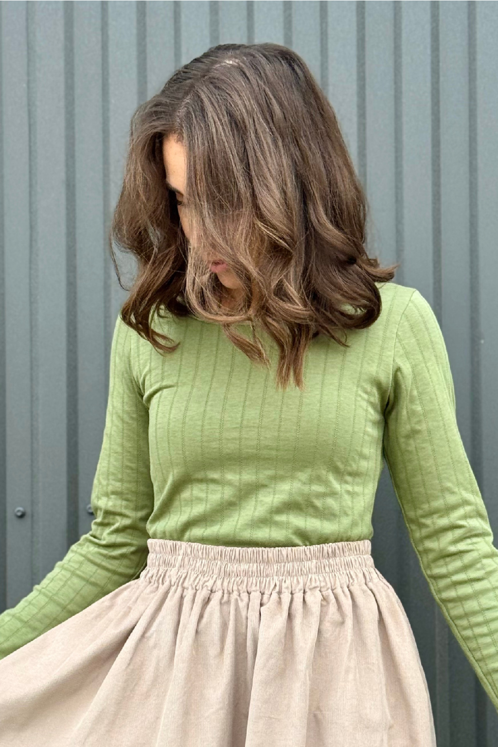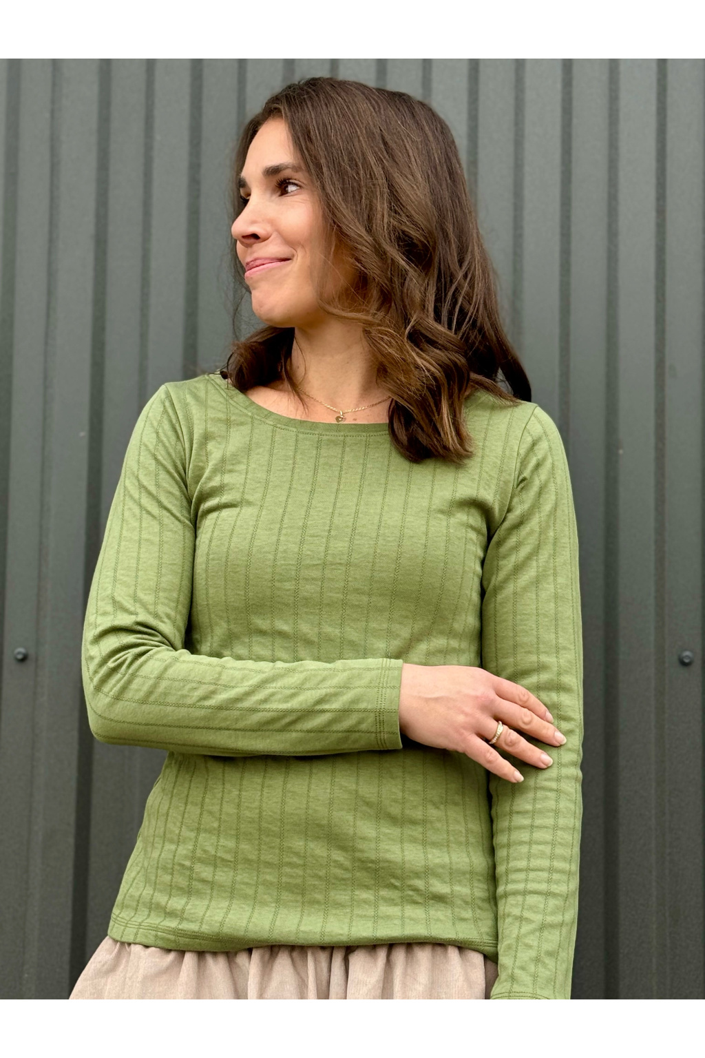 Modelka má na sobě: tričko vel. S, kulatý výstřih, dlouhý rukáv.