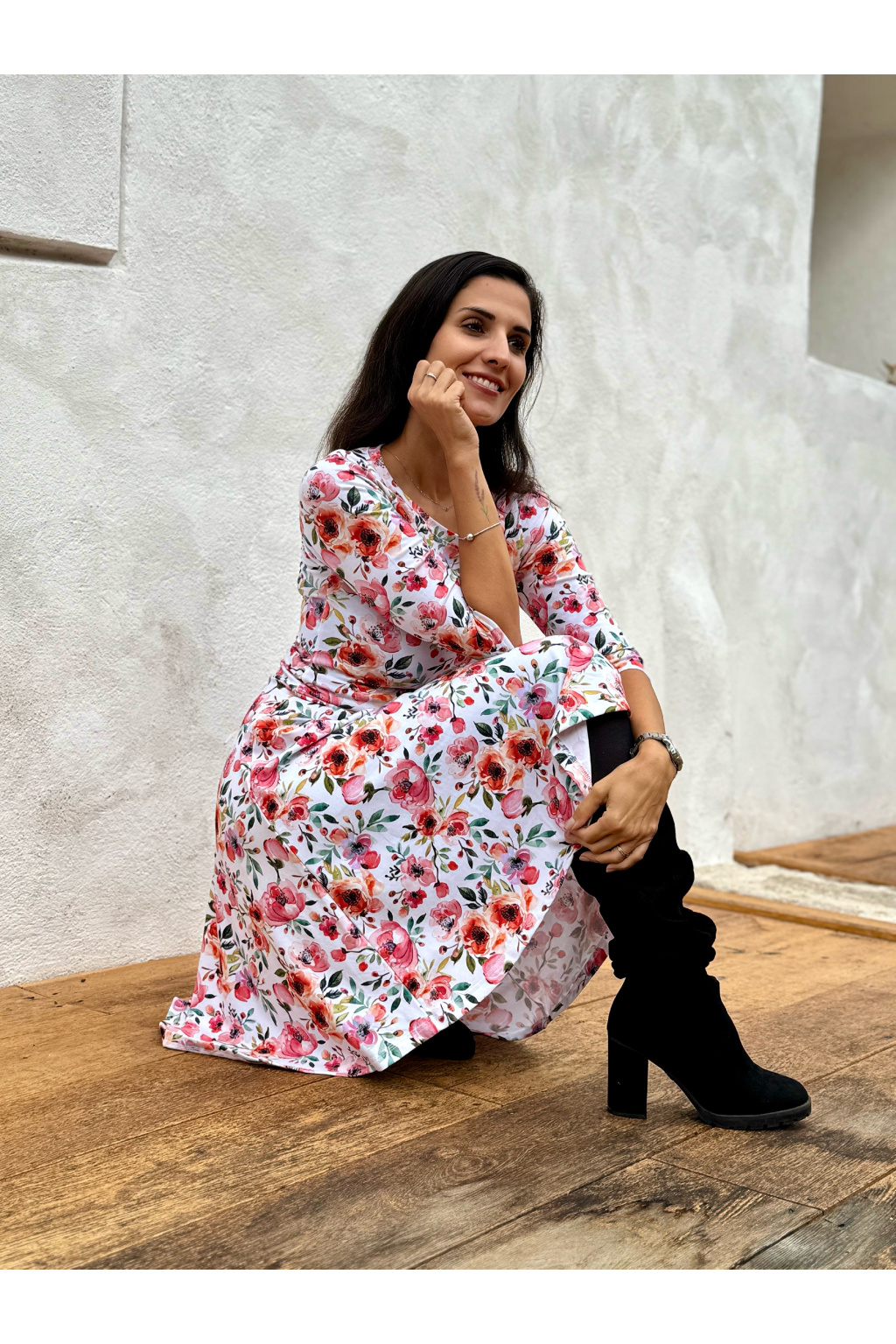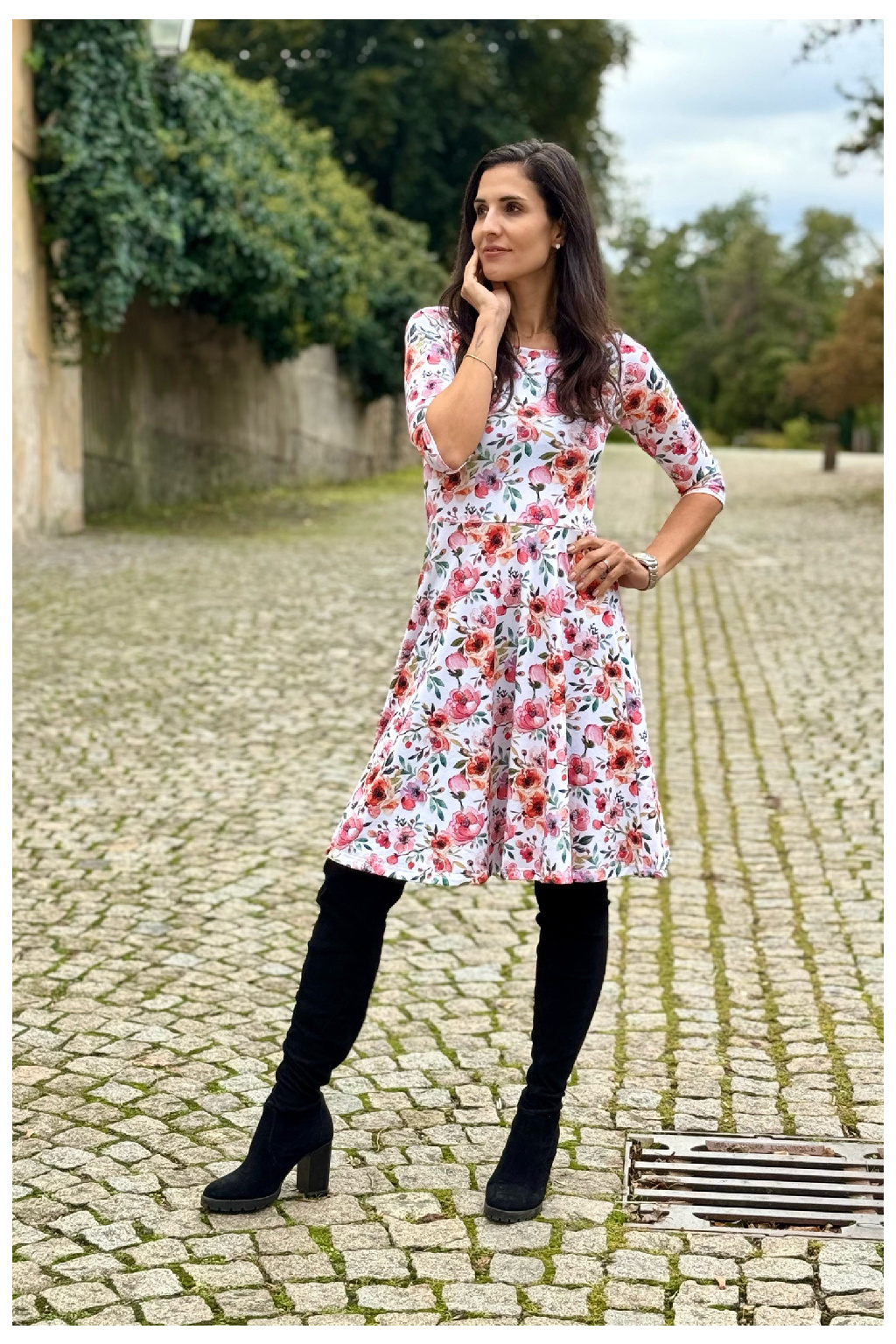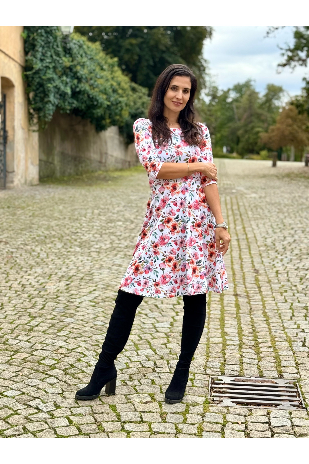 Modelka na fotce má na sobě: šaty vel. XS, krátké s délkou 95 cm, půlkolovou sukni, kulatý výstřih, 3/4 rukáv, je vysoká 170 cm.