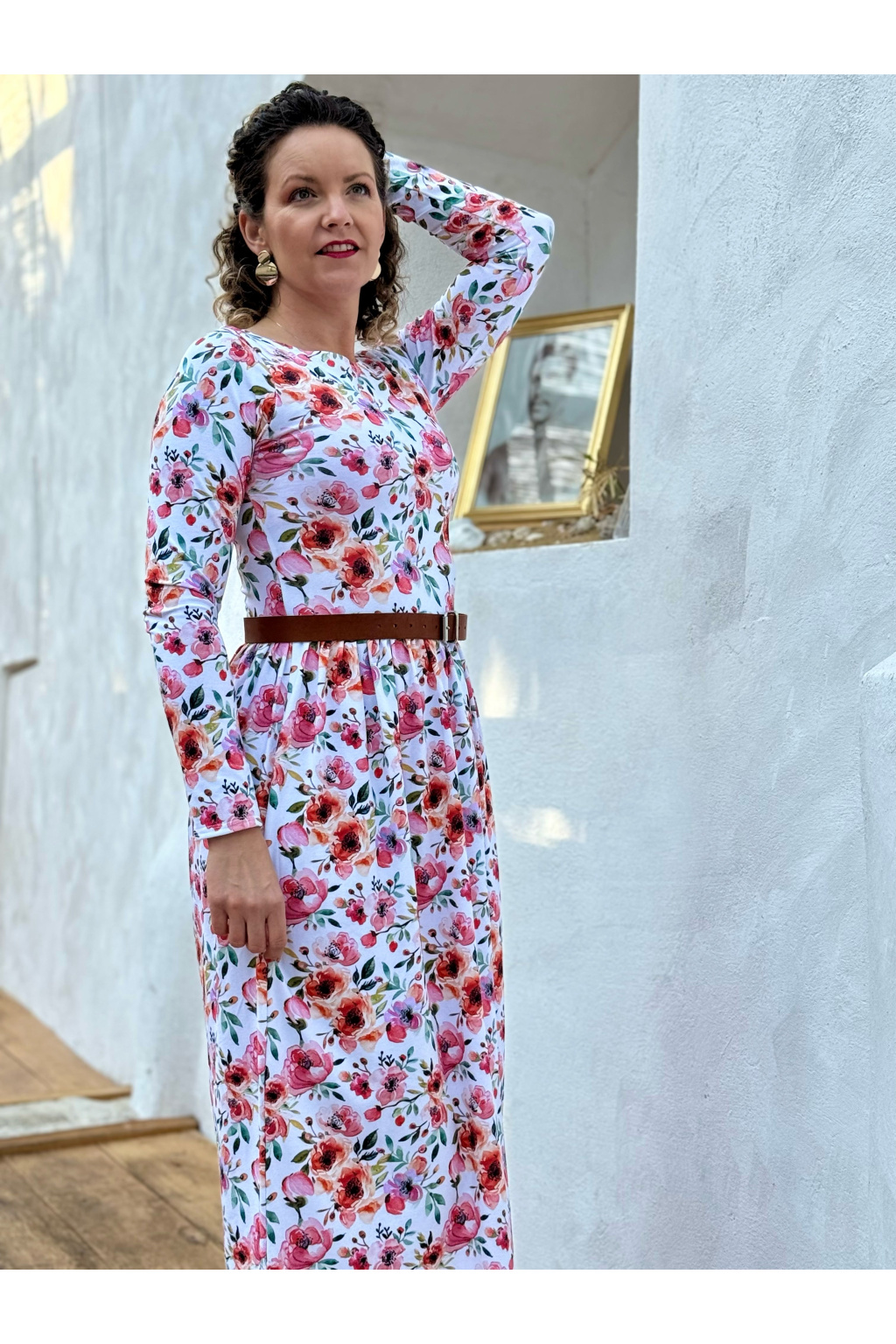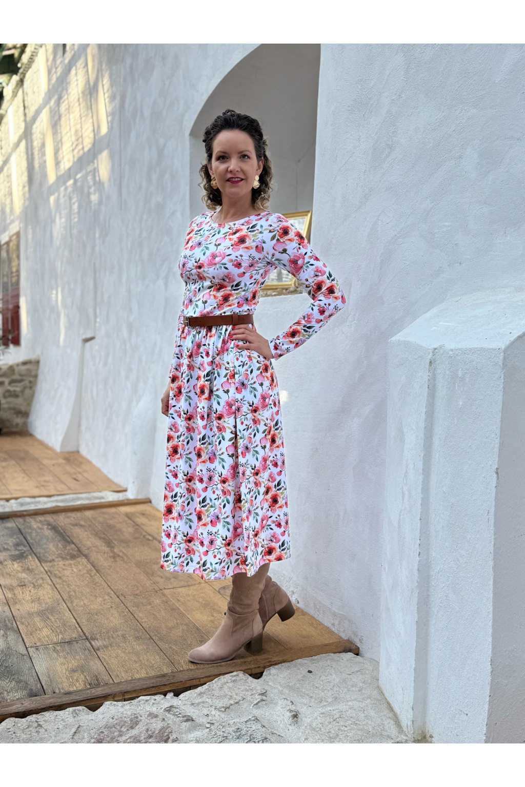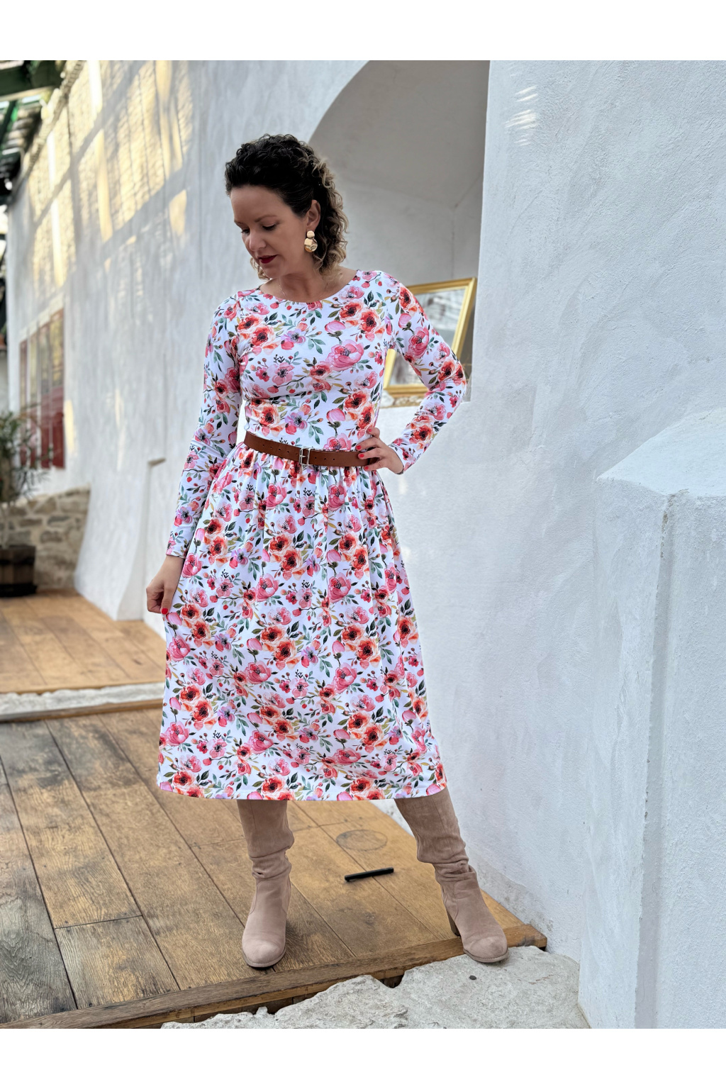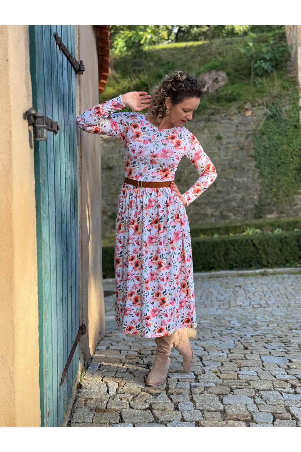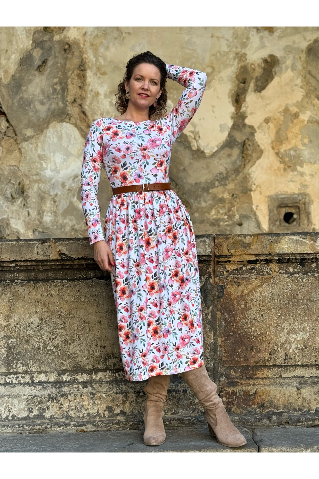 Modelka na fotce má na sobě: šaty vel. S, midi s délkou 120 cm, řasenou sukni, lodičkový výstřih, dlouhý rukáv, je vysoká 171 cm.