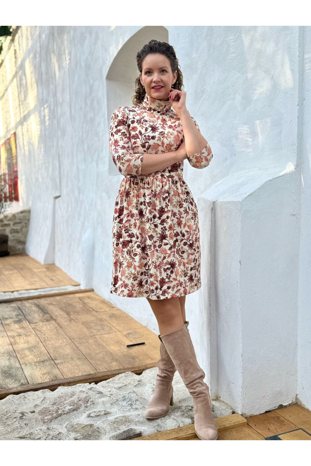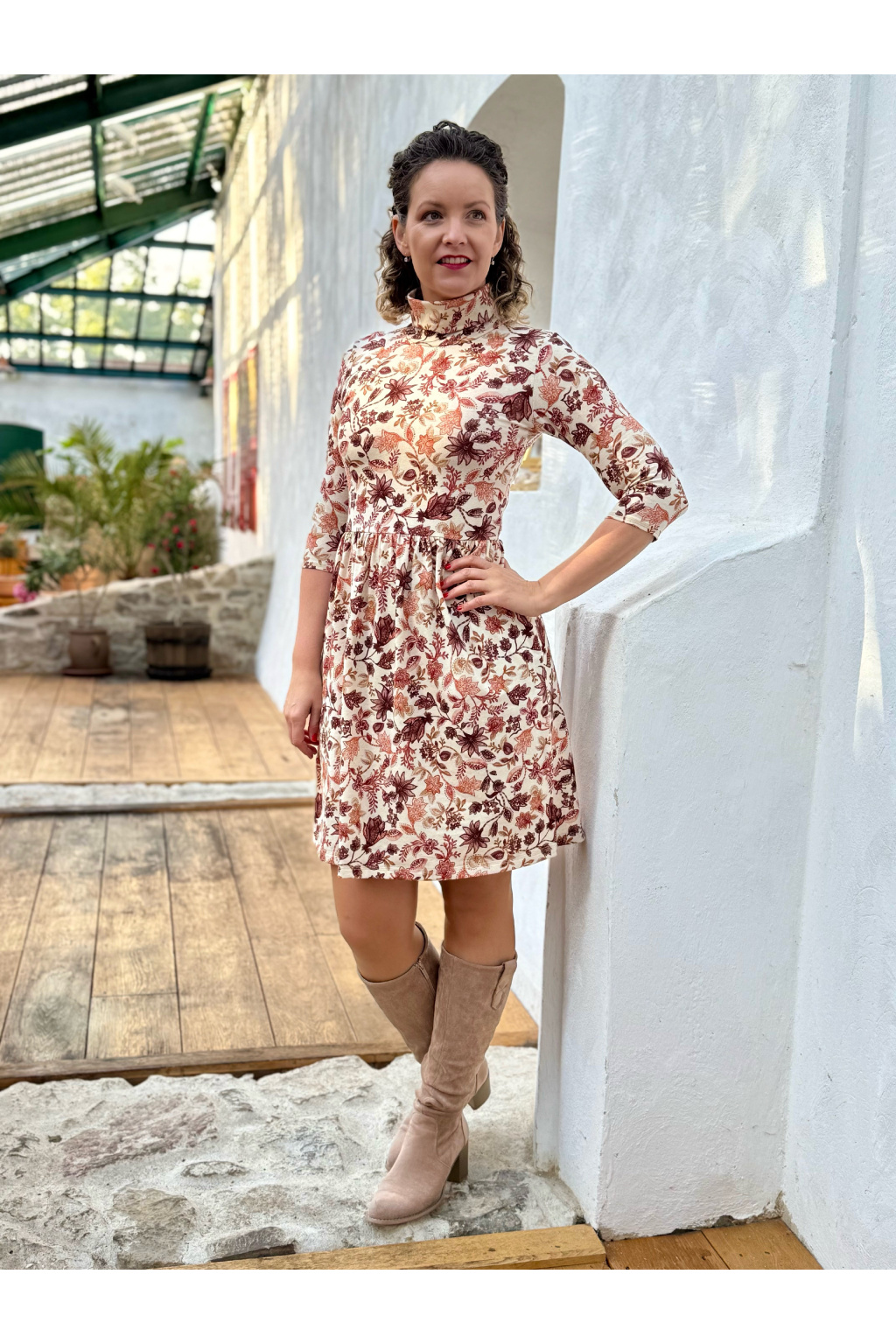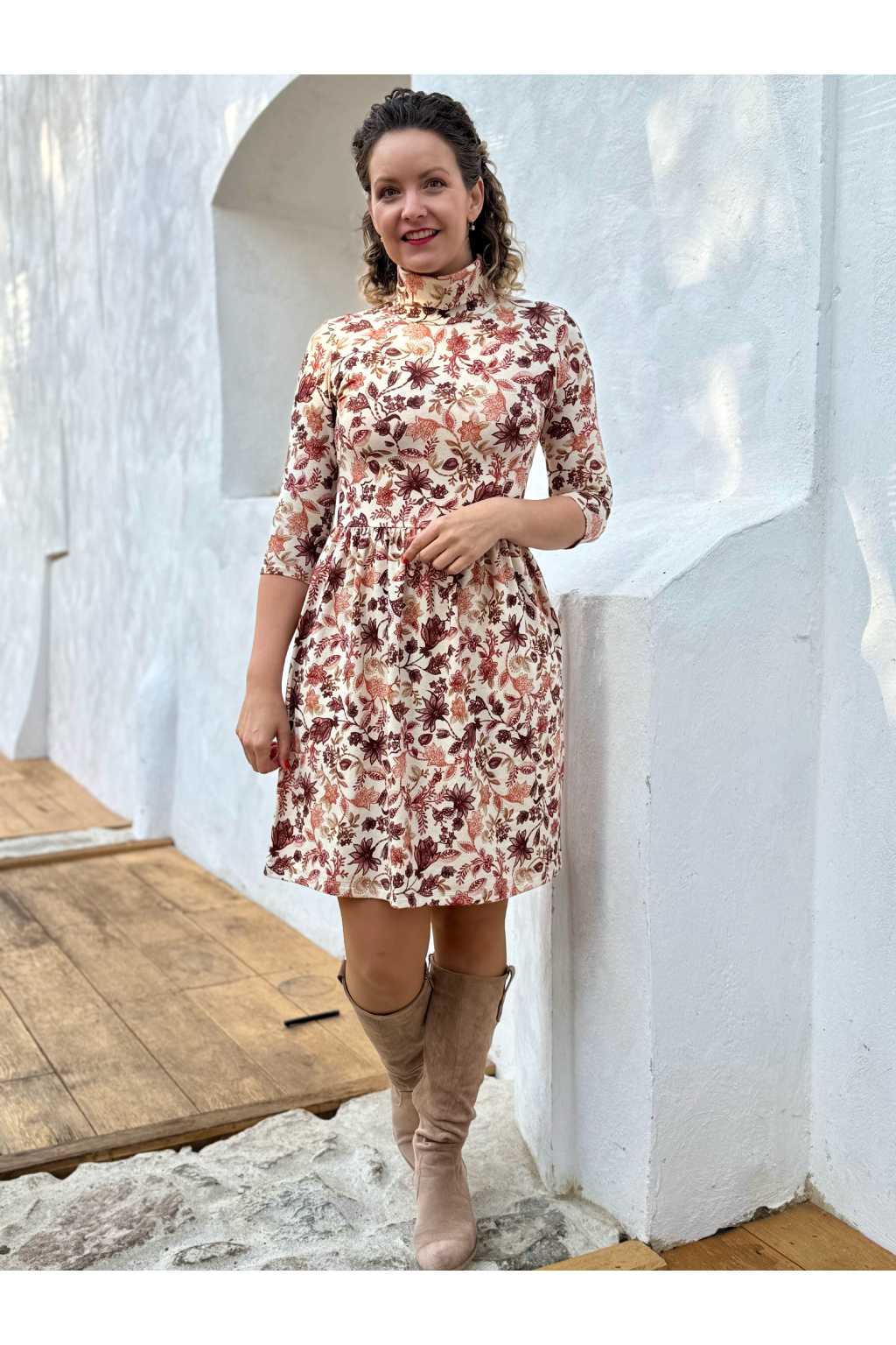 Modelka na fotce má na sobě: šaty vel. XS, krátké s délkou 95 cm, řasenou sukni, rolák, 3/4 rukáv.