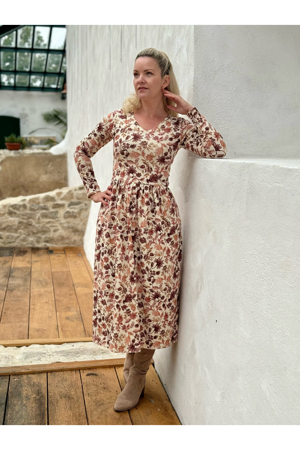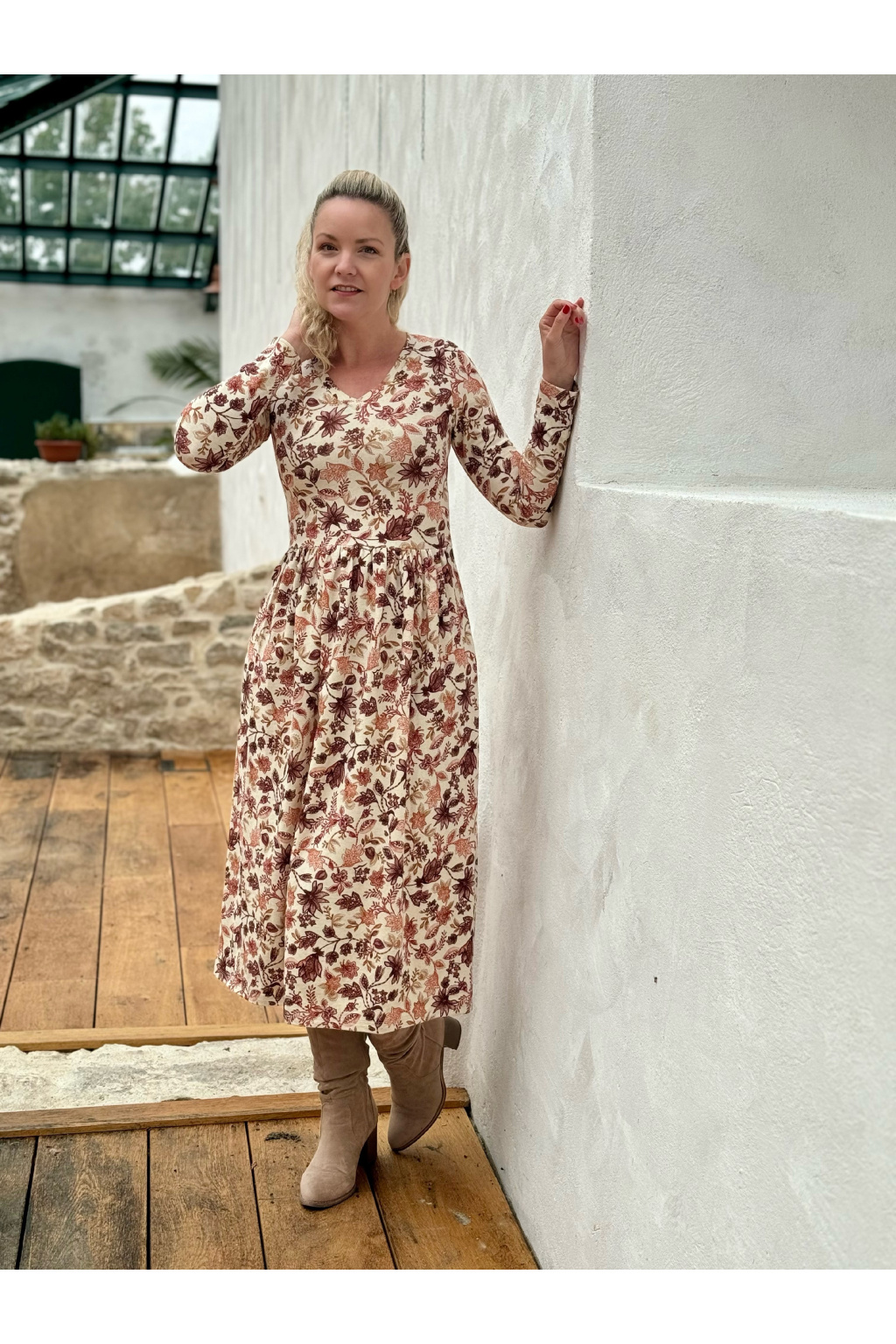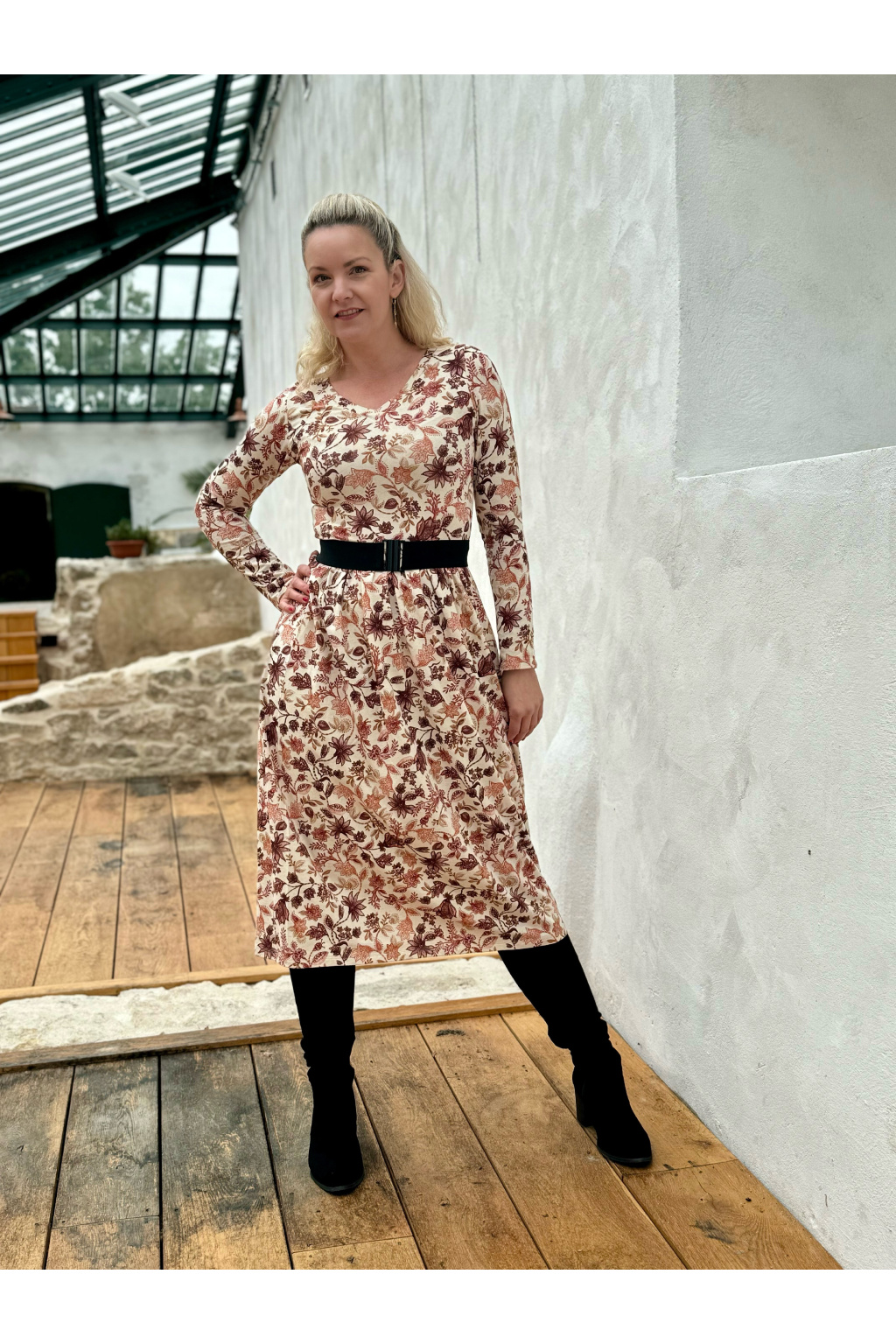Modelka na fotce má na sobě: šaty vel. XS, midi s délkou 120 cm, řasenou sukni, véčkový výstřih, dlouhý rukáv.